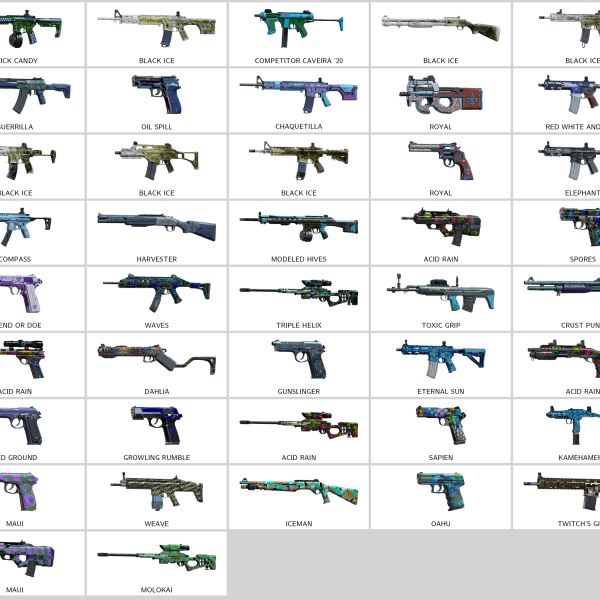 – Berber Ornaments (AK-74M), Colorful Dance (ARX200), Amber Tech (F2), Metallurgic Burn (9mm C1), Air Raid (CSRX300), Premium Snack (Mk 14 EBR)…