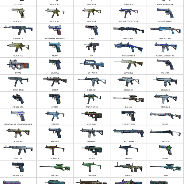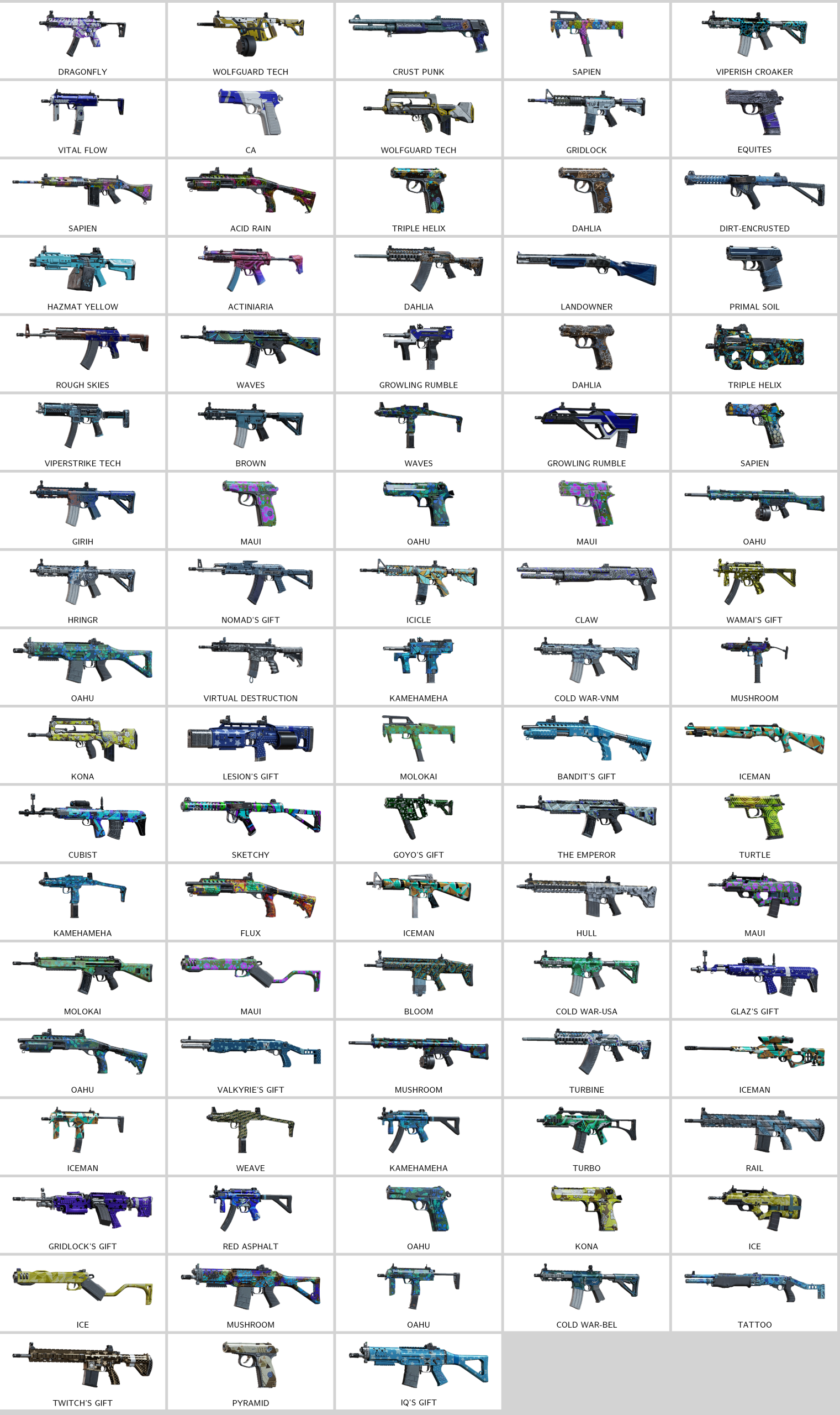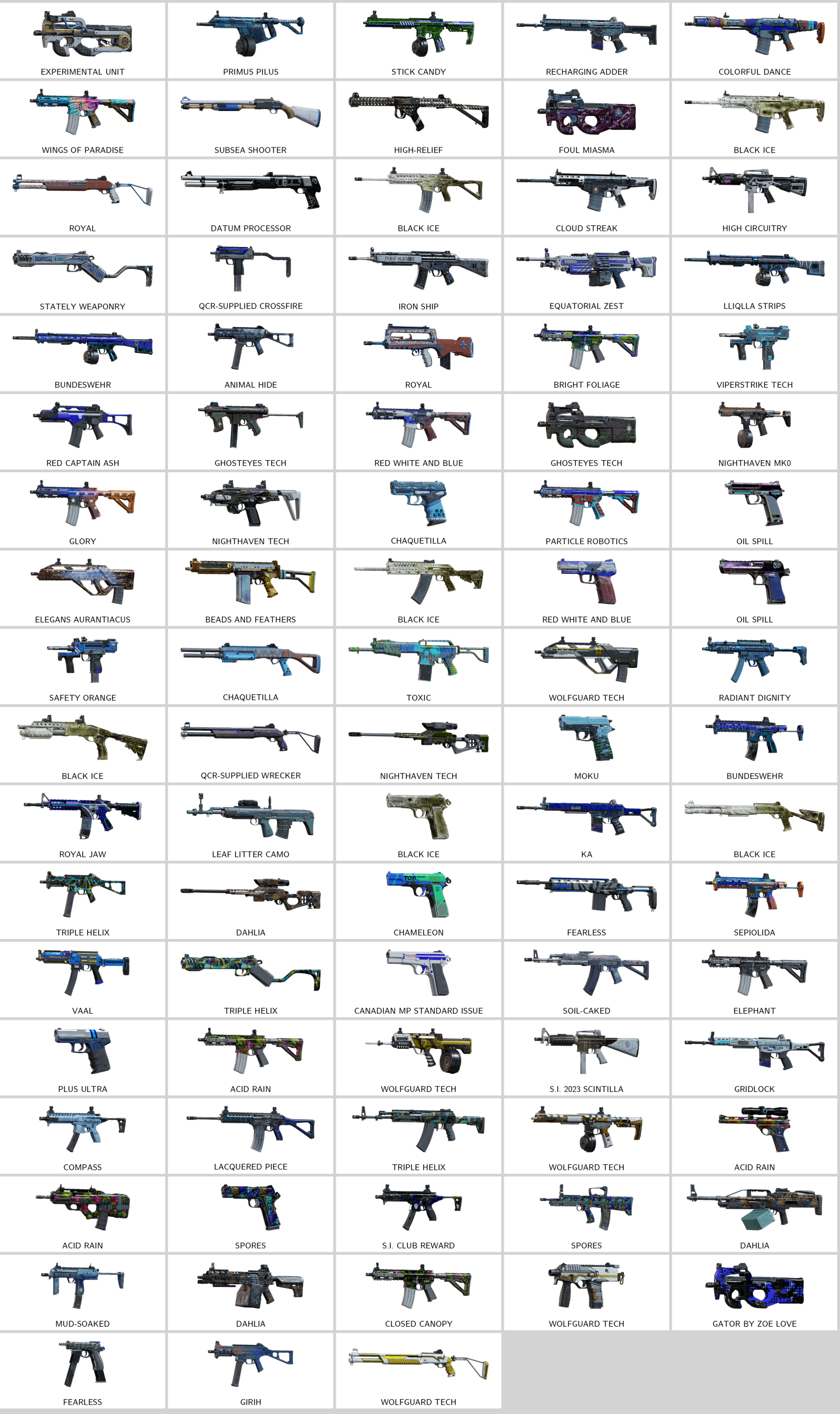 – Arctic Range (C8-SFW), Colorful Dance (ARX200), Metallurgic Burn (9mm C1), Experimental Unit (P90), Primus Pilus (V308), The Old Stock (L85A2)…
