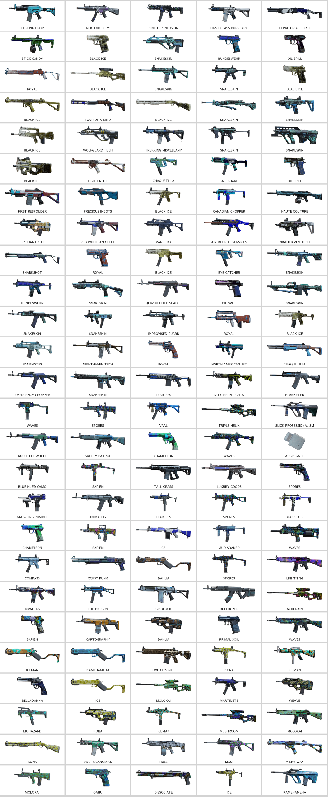 Some Skins: Twitch’S Gift, Kamehameha, Blue-Hued Camo, Oil Spill, Lightning, Improvised Guard, Cartography, Acid Rain, Mushroom, Ice, Blanketed, Invaders, Aggregate, Ca, Nighthaven Tech, Milky Way, Black Ice, Four Of A Kind, Qcr-Supplied Spades, Haute Couture, Territorial Force, Red White And Blue, Mud-Soaked, Crust Punk, Brilliant Cut, Sapien, Weave, Vaquero, Slick Professionalism, Sinister Infusion, Maui, Northern Lights, Wolfguard Tech, Safeguard, Biohazard, Sharkshot, Stick Candy, North American Jet, Chaquetilla, Bundeswehr, Molokai, Chameleon, Trekking Miscellany, Gridlock, Dissociate, Eye-Catcher, A…