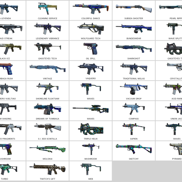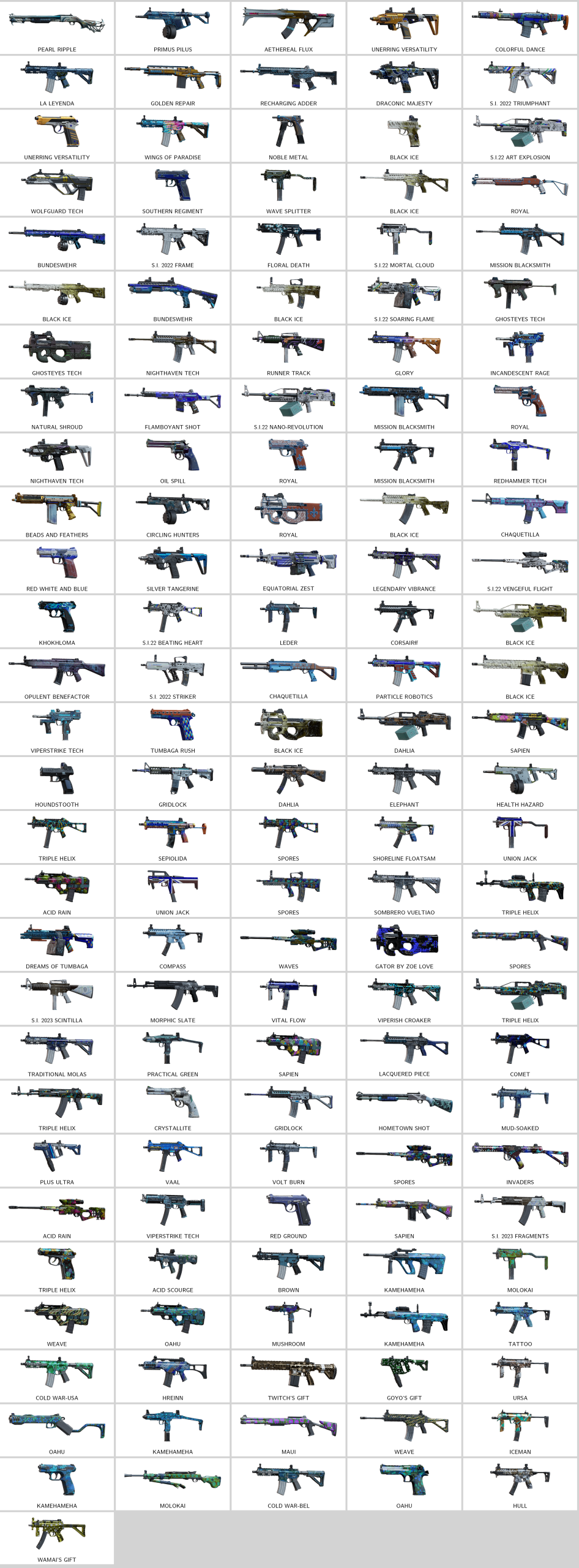 – Colorful Dance (ARX200), Unerring Versatility (P10 Roni), Unerring Versatility (PRB92), Golden Repair (Mk 14 EBR), Coffee Stain (F90), Primus Pilus (V308)…