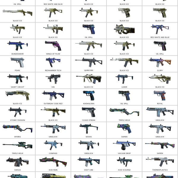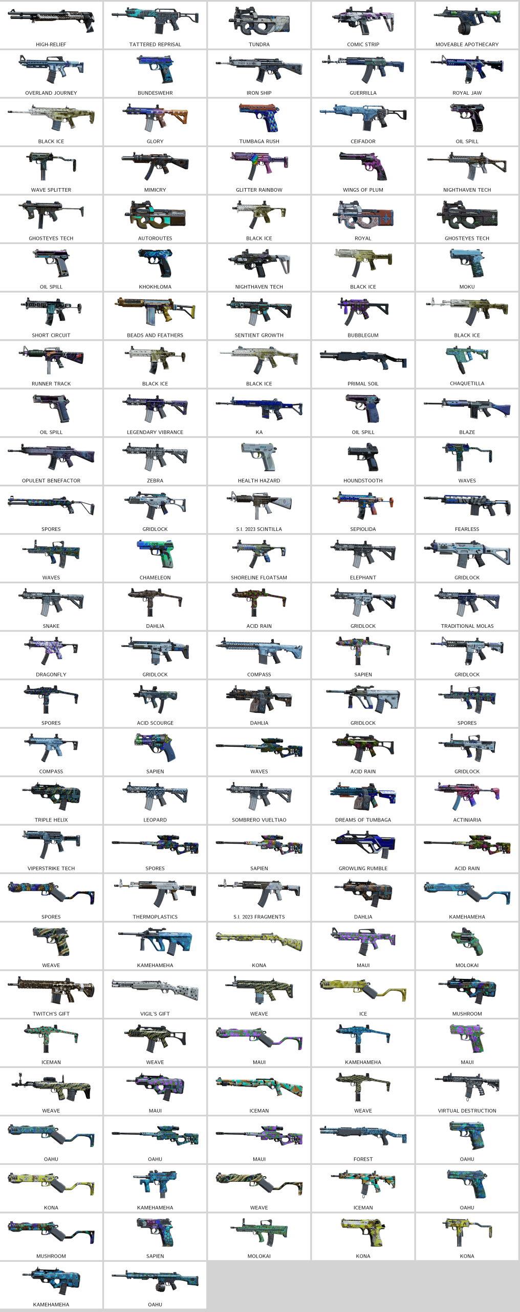 – Tundra (P90), Ethereal Marksman (416-C), Comic Strip (P10 Roni), Metallurgic Burn (9mm C1), High-Relief (Super 90), Unbreakable Shine (CSRX300)…