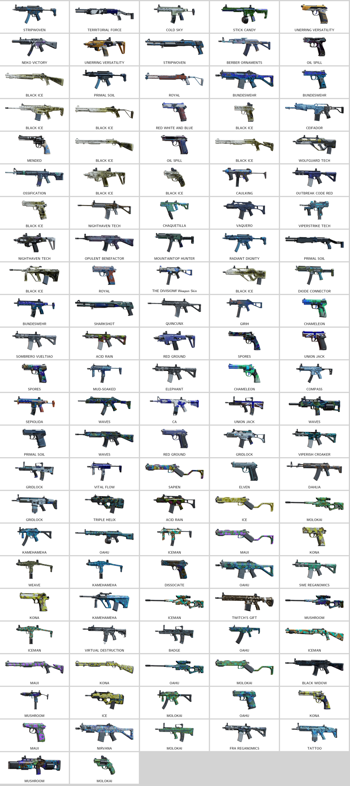 Some of Other Skins: Lacquered Elegance (F2), Gleipnir (MP7), Mended (LFP586), Red White And Blue (M45 Meusoc), Bundeswehr (P12), Royal (SG-CQB), Primal Soil (MP5), Bundeswehr (552 Commando)…