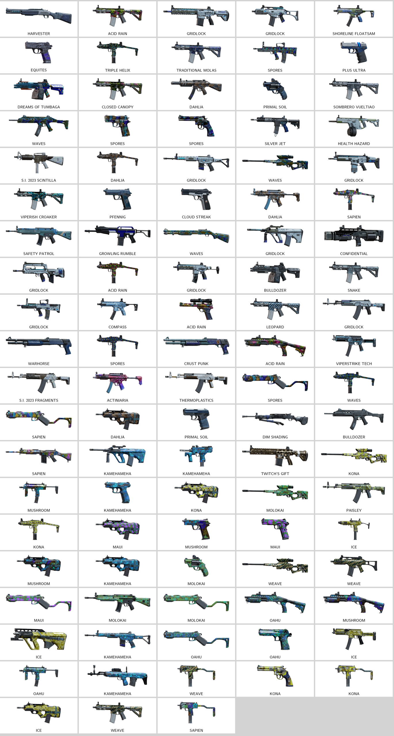 – Colorful Dance (ARX200), Flight of Triumph (M12), Amber Tech (F2), Premium Snack (Mk 14 EBR), Urban Graffiti (Type-89), Intergalactic Cannon (552 Commando)…