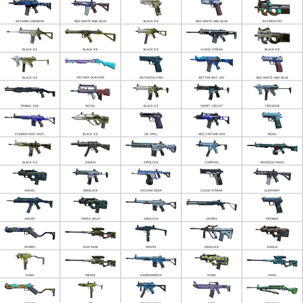 – Metallurgic Burn (9mm C1), High-Relief (Super 90), Stone Talon (T-5 SMG), Neko Victory (MP5SD), Tattered Reprisal (M12), Subsea Shooter (M590A1)…