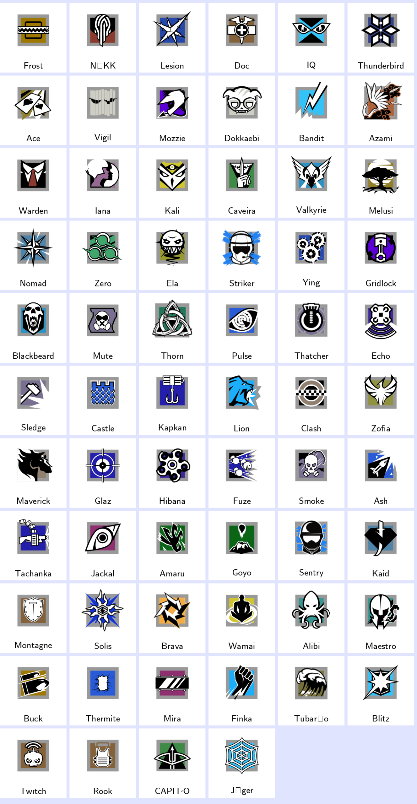 Some Operators: Frost, Nokk, Lesion, Doc, Iq, Thunderbird, Ace, Vigil, Mozzie, Dokkaebi…