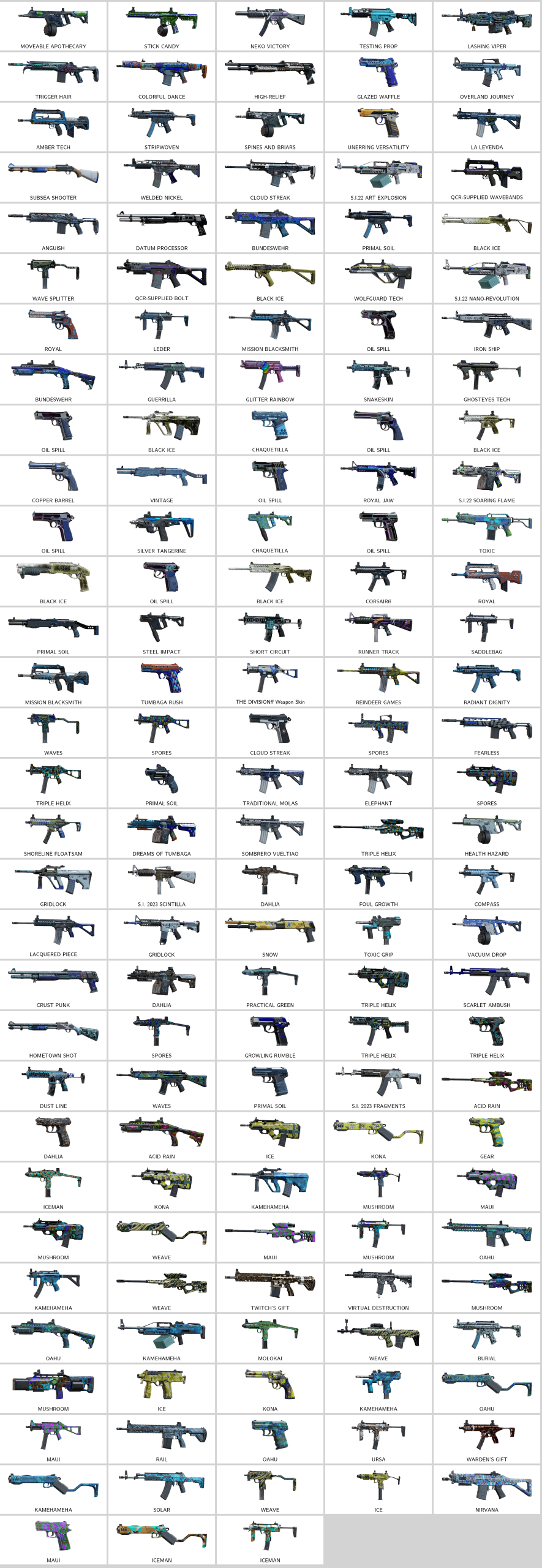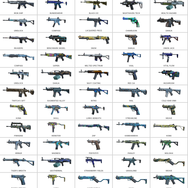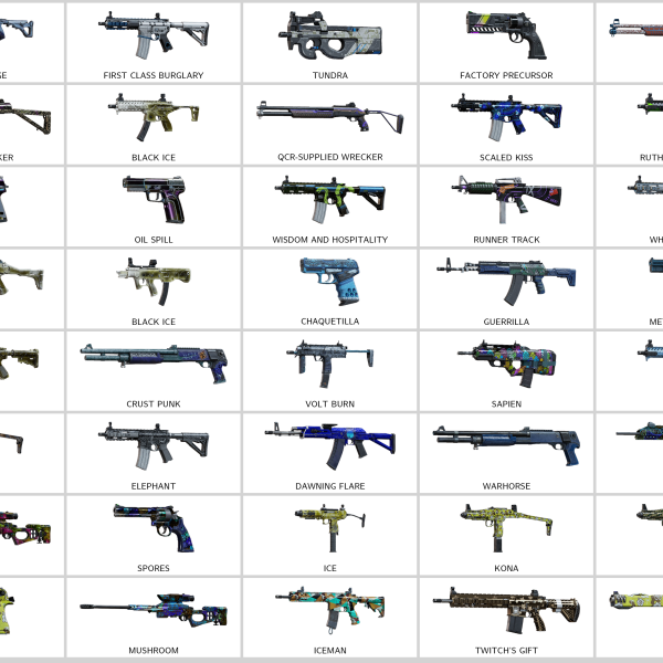 – Testing Prop (K1A), Ethereal Marksman (416-C), Colorful Dance (ARX200), Flight of Triumph (M12), Amber Tech (F2), Metallurgic Burn (9mm C1)…