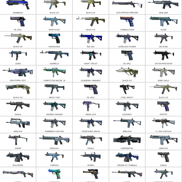 – Ethereal Marksman (416-C), Amber Tech (F2), Intergalactic Cannon (552 Commando), Stone Talon (T-5 SMG), Stripwoven (Super 90), Viral Douser (F2)…