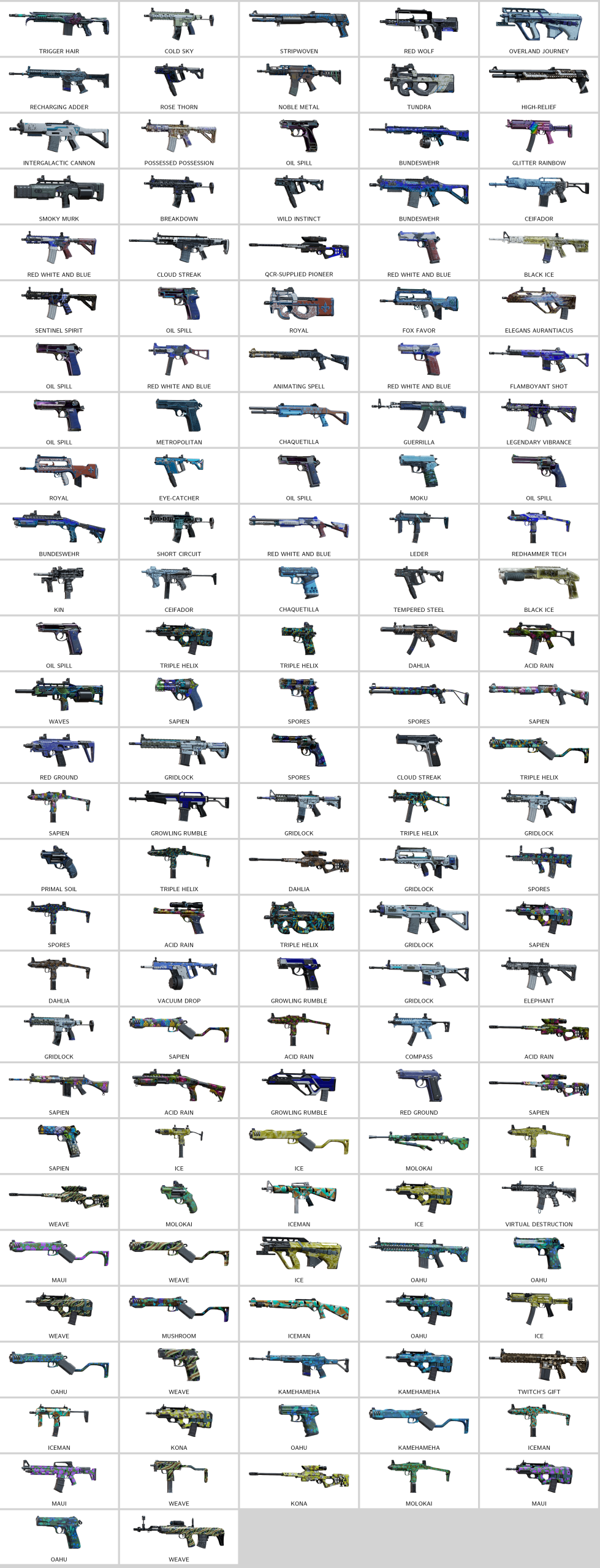 – Tundra (P90), Ethereal Marksman (416-C), Mythical Majesty (AK-74M), Urban Graffiti (Type-89), Intergalactic Cannon (552 Commando), High-Relief (Super 90)…