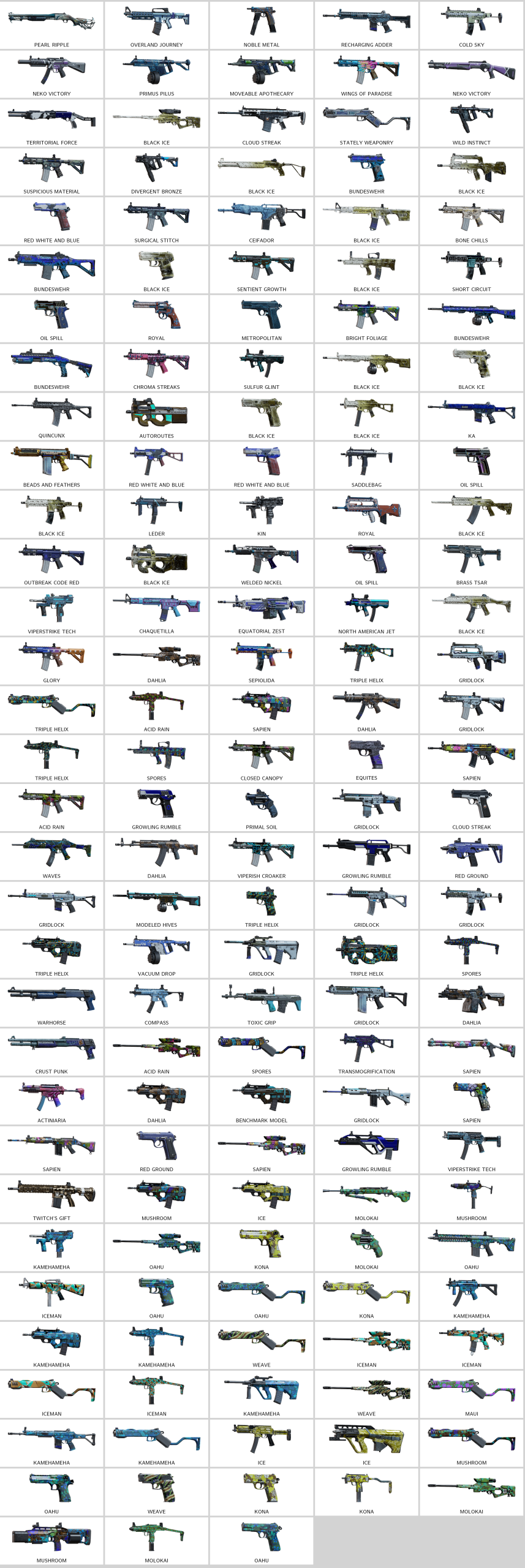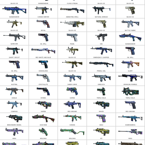 – Subatomic Beam (PDW9), Ethereal Marksman (416-C), Arctic Range (C8-SFW), Flight of Triumph (M12), Metallurgic Burn (9mm C1), Air Raid (CSRX300)…