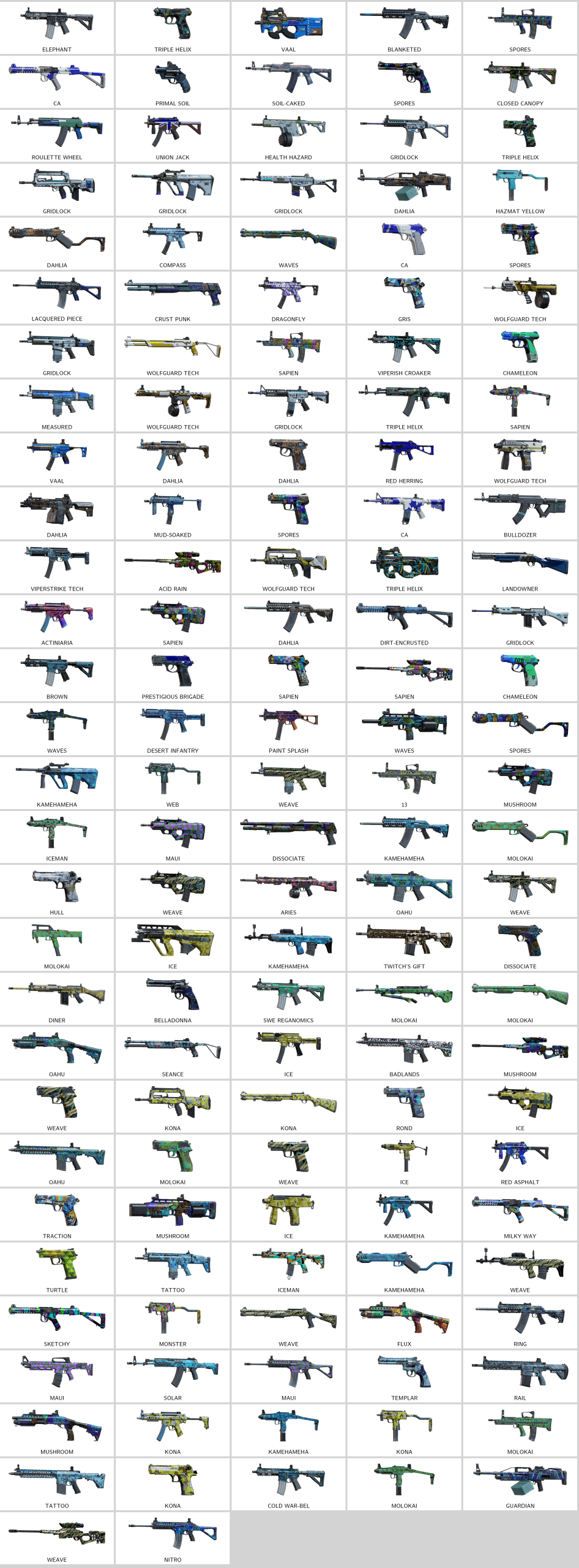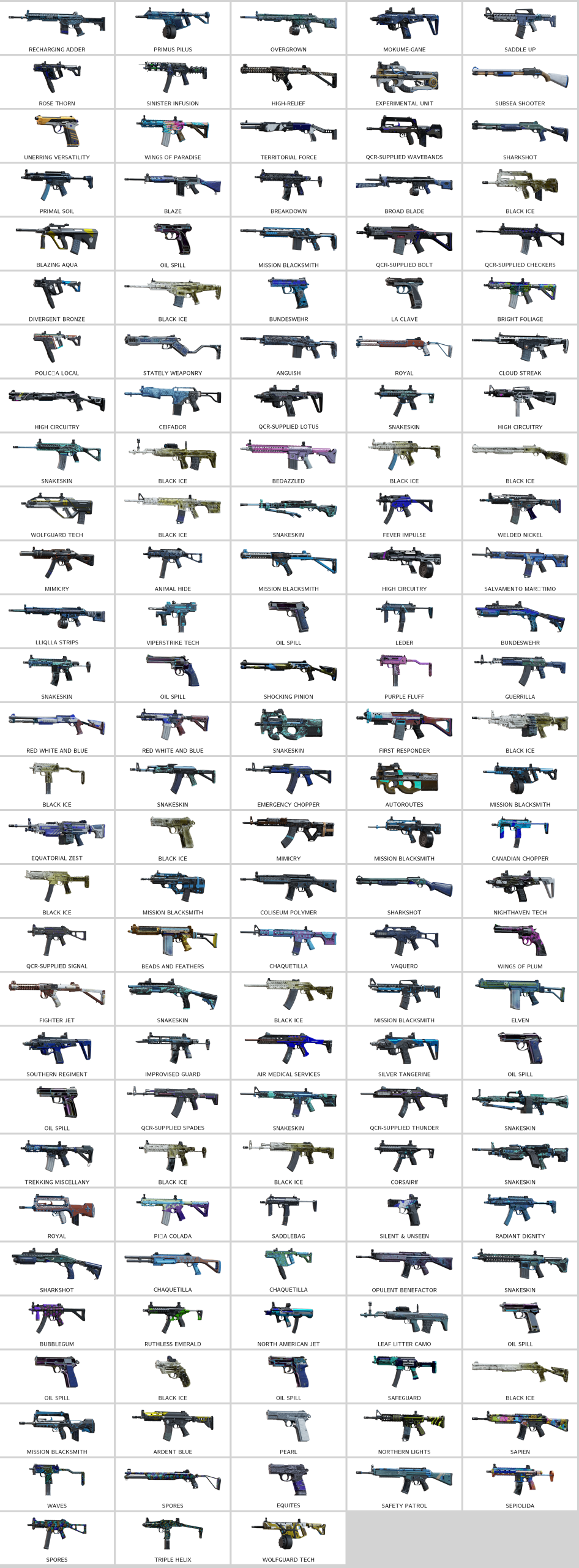 Some of Other Skins: Lacquered Elegance (F2), Mission Blacksmith (9mm C1), Gleipnir (MP7), Snakeskin (DP27), QCR-Supplied Lotus (P10 Roni), High Circuitry (Commando 9), Snakeskin (MPX), Bundeswehr (P12)…