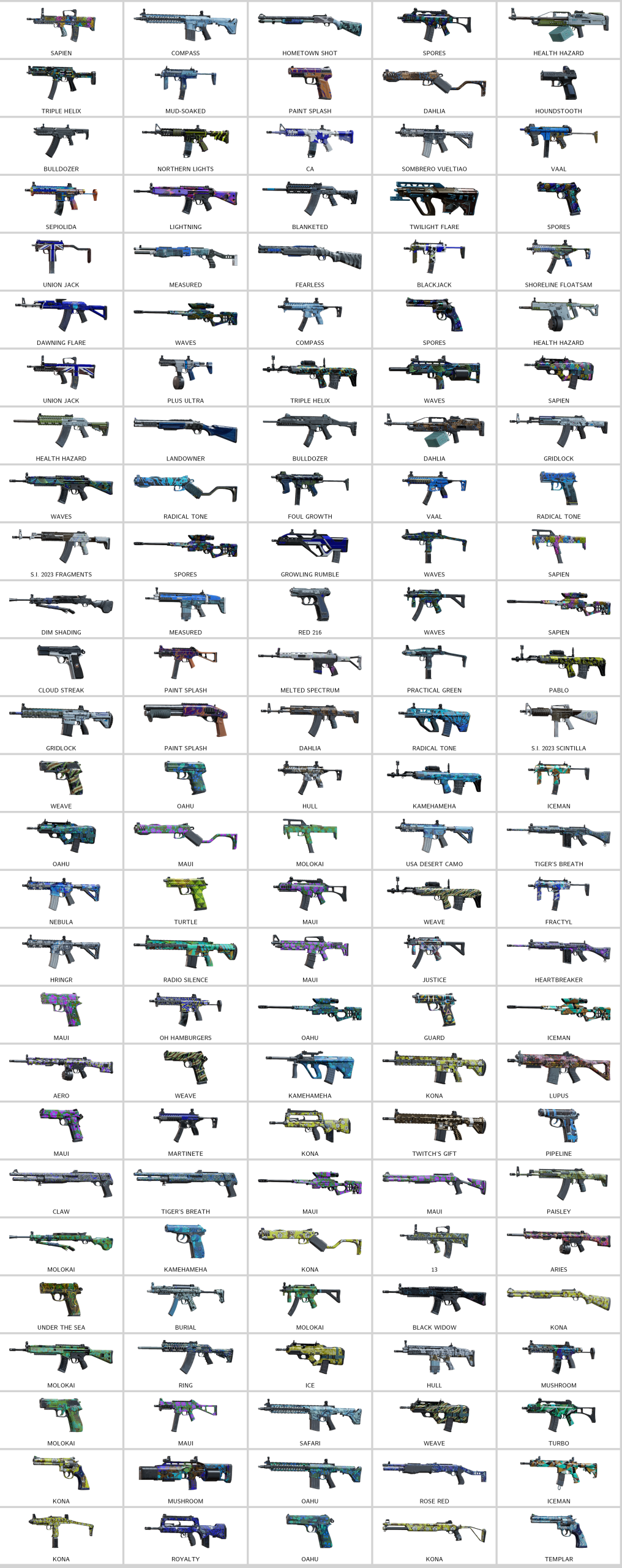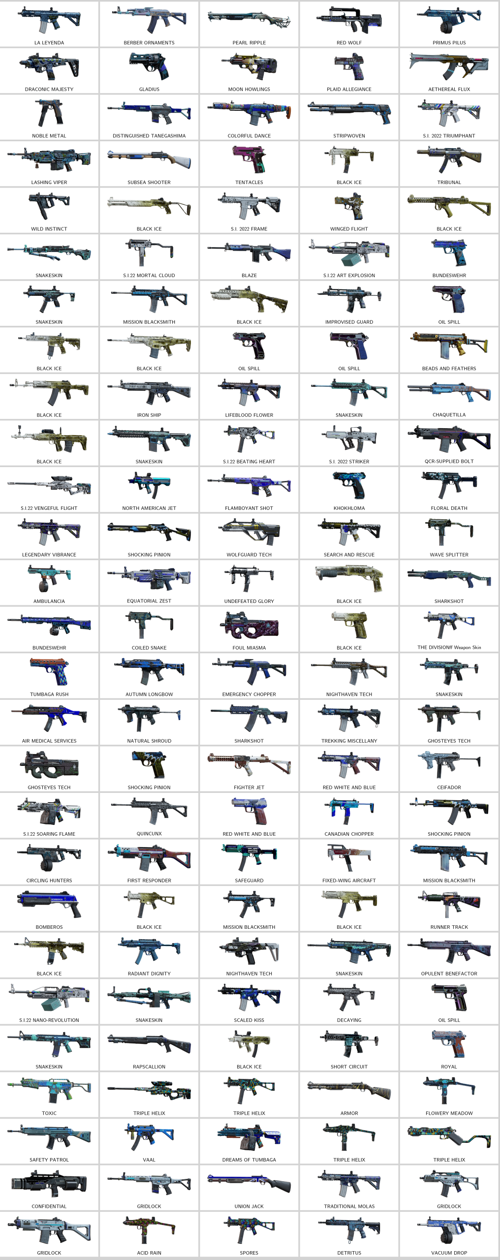 Some of Other Skins: Datum Processor (SC3000K), Mission Blacksmith (556XI), SI22 Mortal Cloud (SMG-11), Snakeskin (DP27), S.I. 2022 Frame (R4C), Winged Flight (RG15), Snakeskin (MPX), Bundeswehr (P12)…
