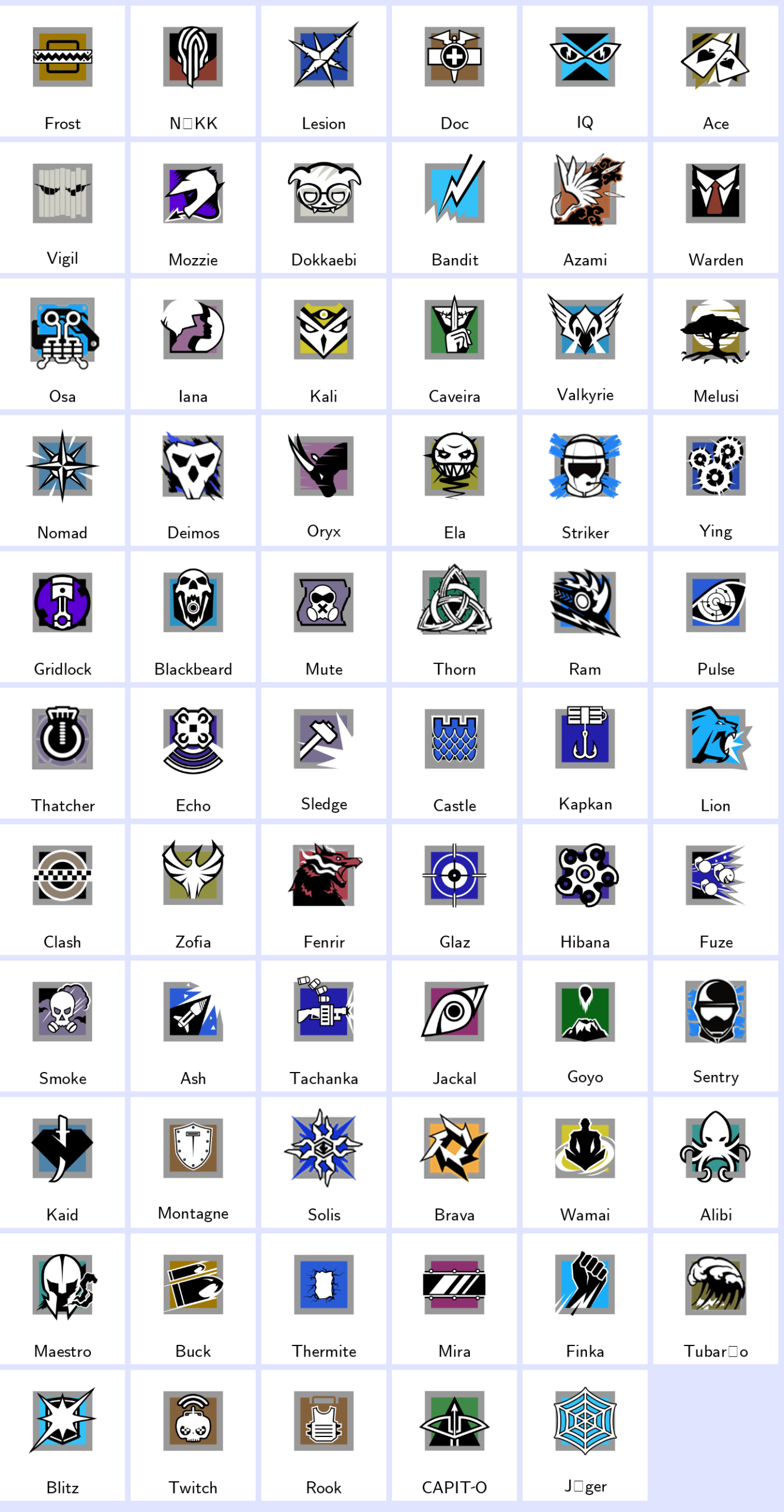 Some Operators: Frost, Nokk, Lesion, Doc, Iq, Ace, Vigil, Mozzie, Dokkaebi, Bandit…