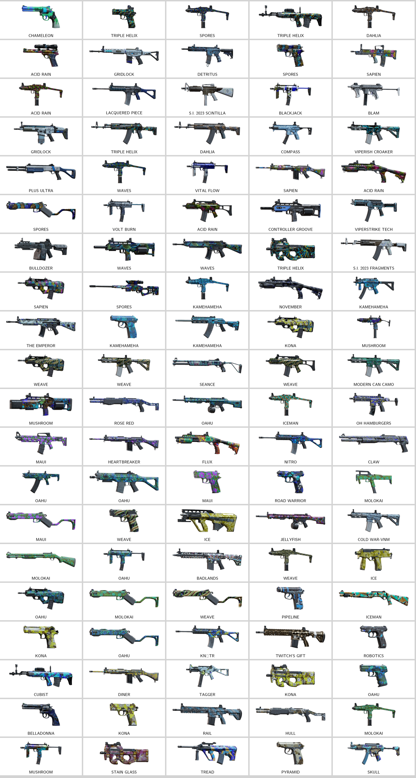 – Berber Ornaments (AK-74M), Colorful Dance (ARX200), Metallurgic Burn (9mm C1), Urban Graffiti (Type-89), Unerring Versatility (PRB92), Tentacle Lace (ACS12)…