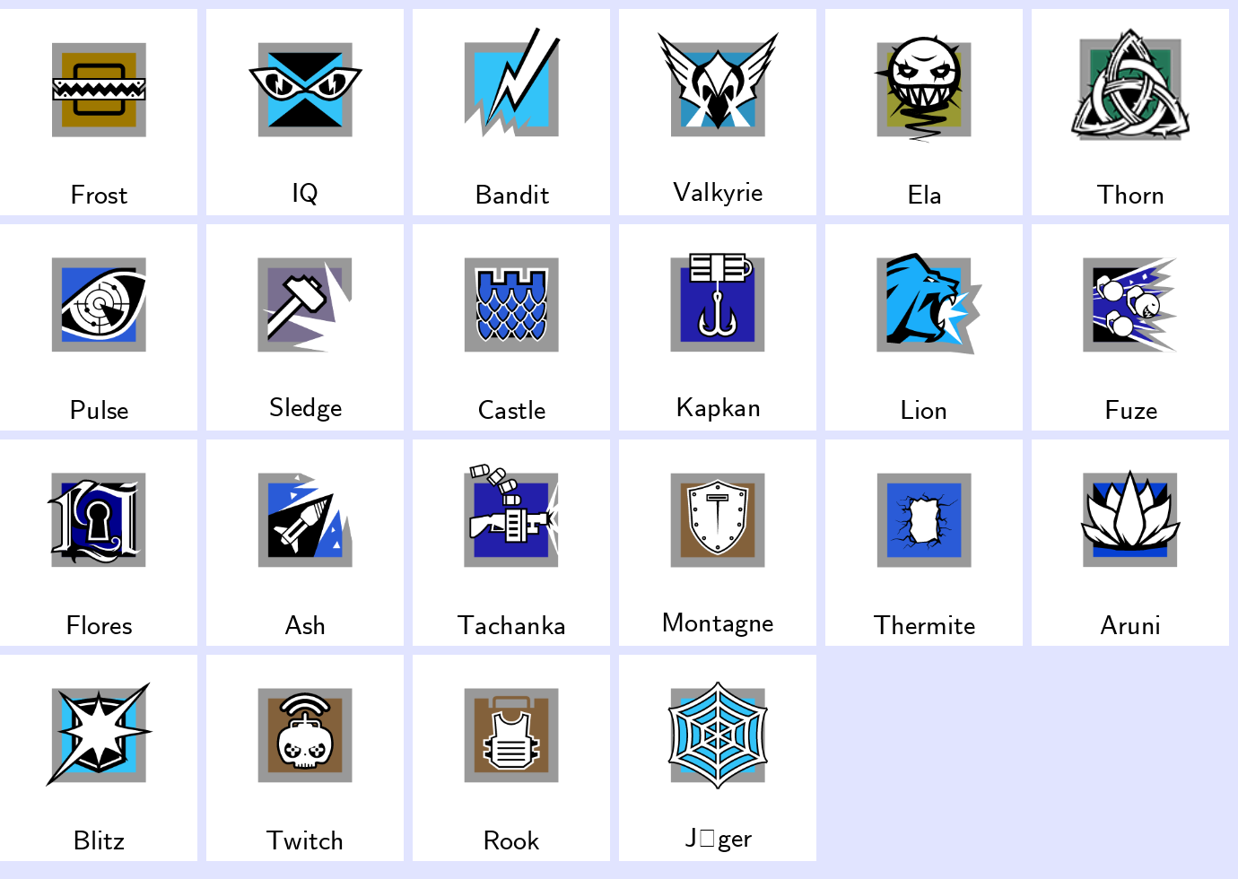 Some Operators: Frost, Iq, Bandit, Valkyrie, Ela, Thorn, Pulse, Sledge, Castle, Kapkan…