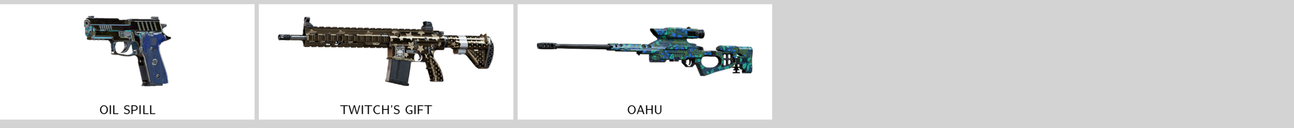 Some of Other Skins: Target (R4C), Glory (5.7 USG), Hard Serve (MP7), Oil Spill (P229), Quicksand (GSH-18), Oahu (416-C), Oahu (CSRX300), Twitch’s Gift (417)