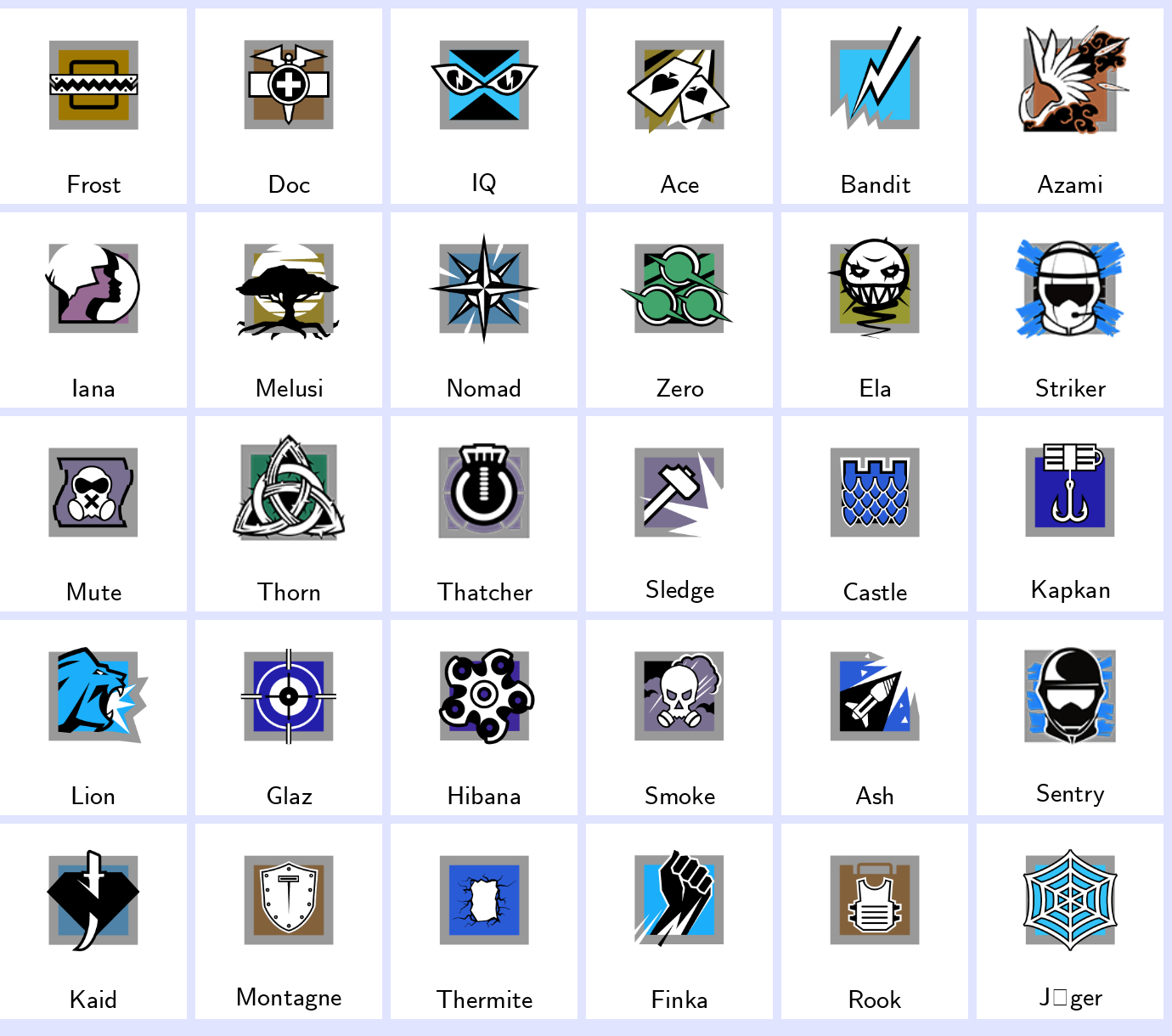 Some Operators: Frost, Doc, Iq, Ace, Bandit, Azami, Iana, Melusi, Nomad, Zero…