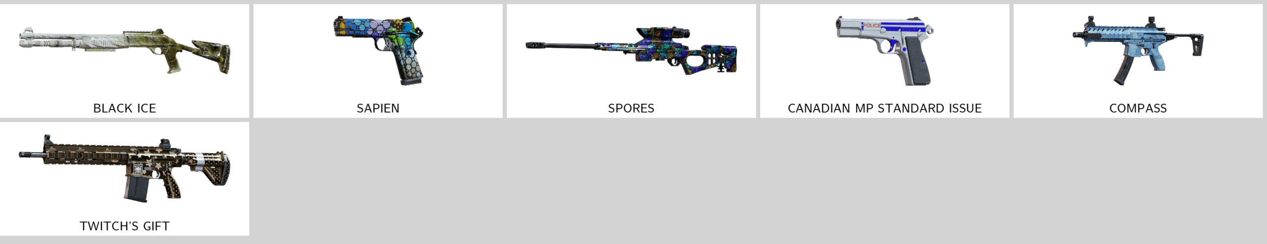 Some of Other Skins: Target (R4C), Leder (M870), Landslide (L85A2), Compass (MPX), Canadian Mp Standard Issue (Mk1 9mm), Spores (CSRX300), Sapien (M45 Meusoc), Twitch’s Gift (417)