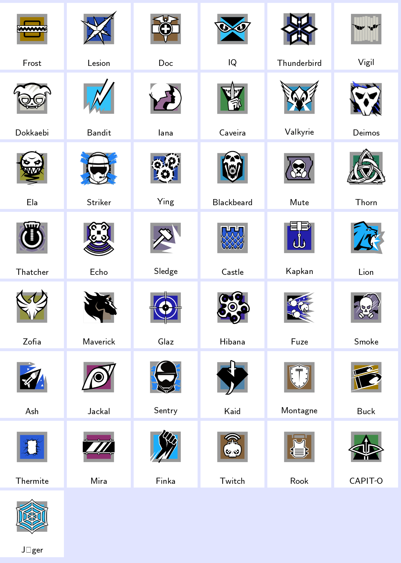 Some Operators: Frost, Lesion, Doc, Iq, Thunderbird, Vigil, Dokkaebi, Bandit, Iana, Caveira…
