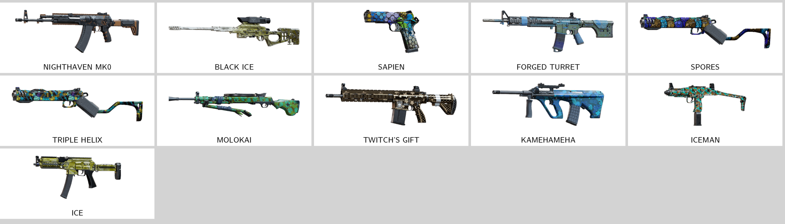 Some of Other Skins: Target (R4C), Nighthaven MK0 (AK12), Khokhloma (SASG-12), Triple Helix (GONNE-6), Spores (GONNE-6), Sapien (M45 Meusoc), Ice (9x19VSN), Iceman (UZK50GI)…