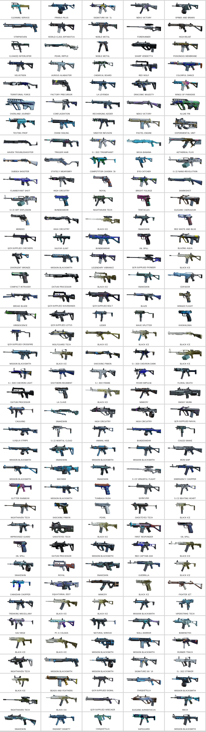– Testing Prop (K1A), Colorful Dance (ARX200), Metallurgic Burn (9mm C1), Experimental Unit (P90), Premium Snack (Mk 14 EBR), Urban Graffiti (Type-89)…