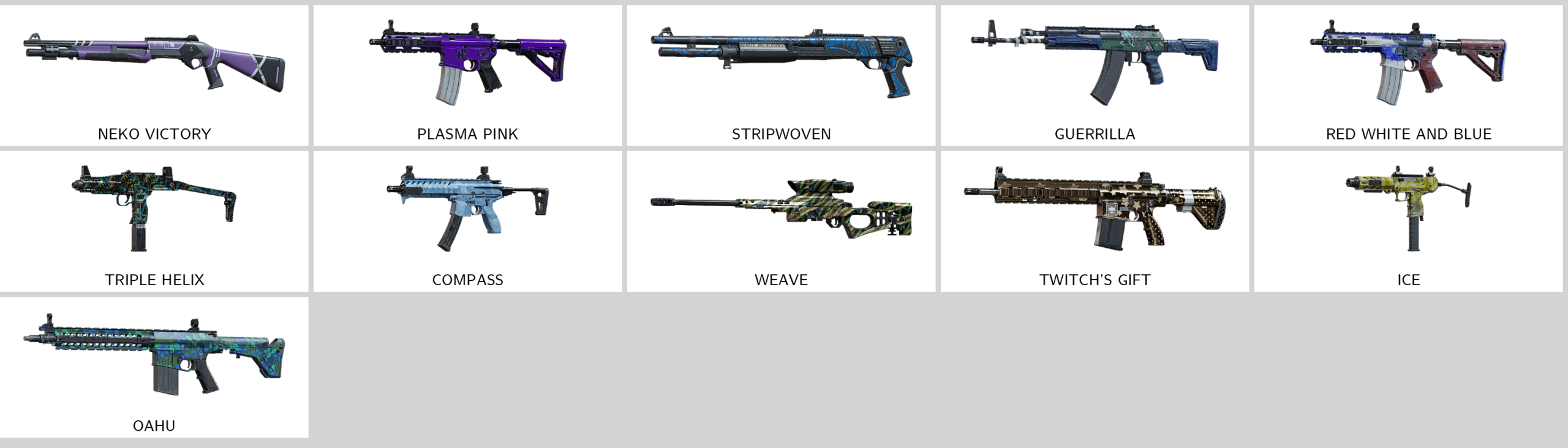 Some of Other Skins: Target (R4C), Red White And Blue (R4C), Hubris (Commando 9), Khokhloma (6P41), Compass (MPX), Cyberfriend (556XI), Triple Helix (UZK50GI), Cyberfriend…