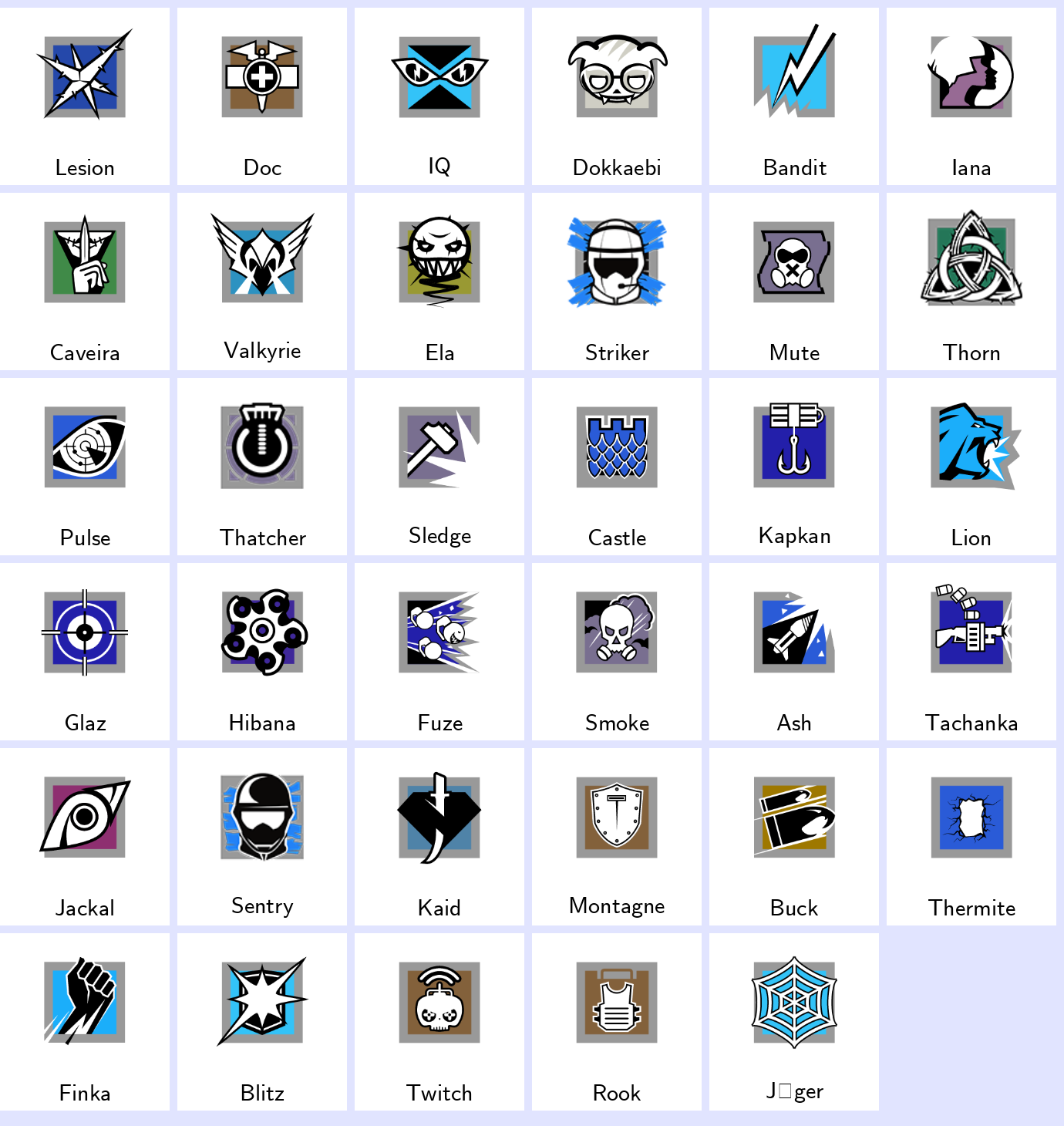 Some Operators: Lesion, Doc, Iq, Dokkaebi, Bandit, Iana, Caveira, Valkyrie, Ela, Striker…