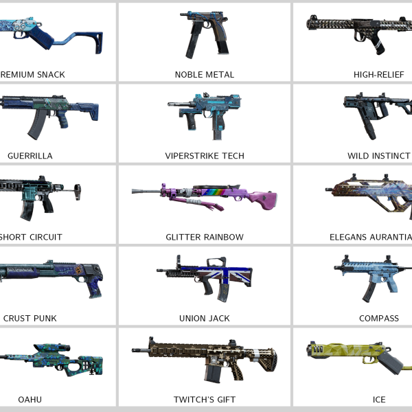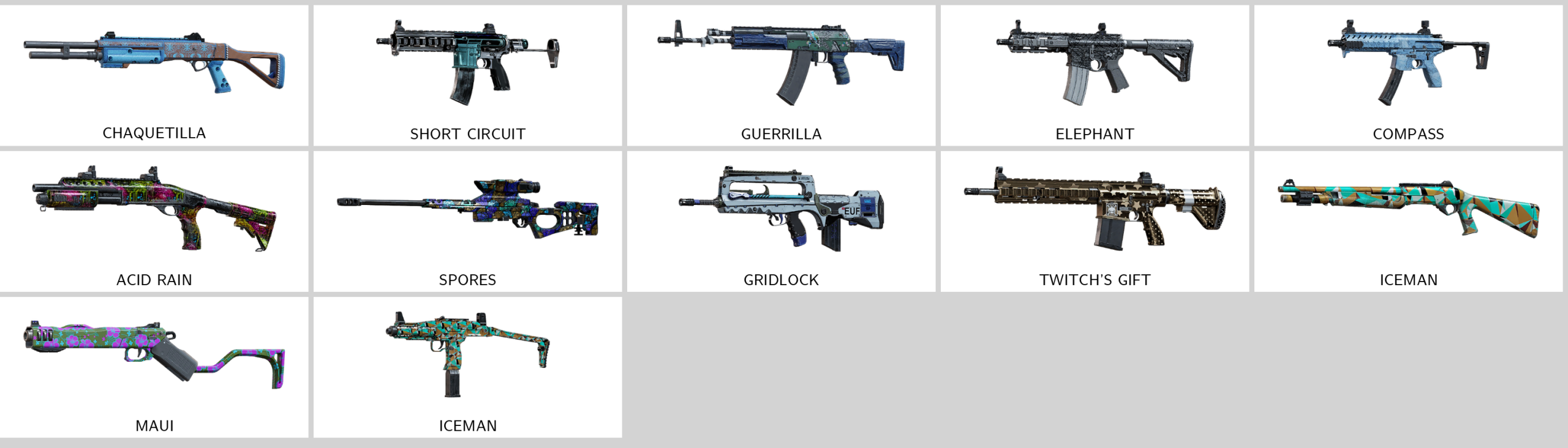 Some of Other Skins: Target (R4C), Cloud Streak (G36C), Datum Processor (M590A1), Short Circuit (416-C), Chaquetilla (ITA12L), Hard Serve (MP7), Devastating Might (M870), Gridlock (F2)…