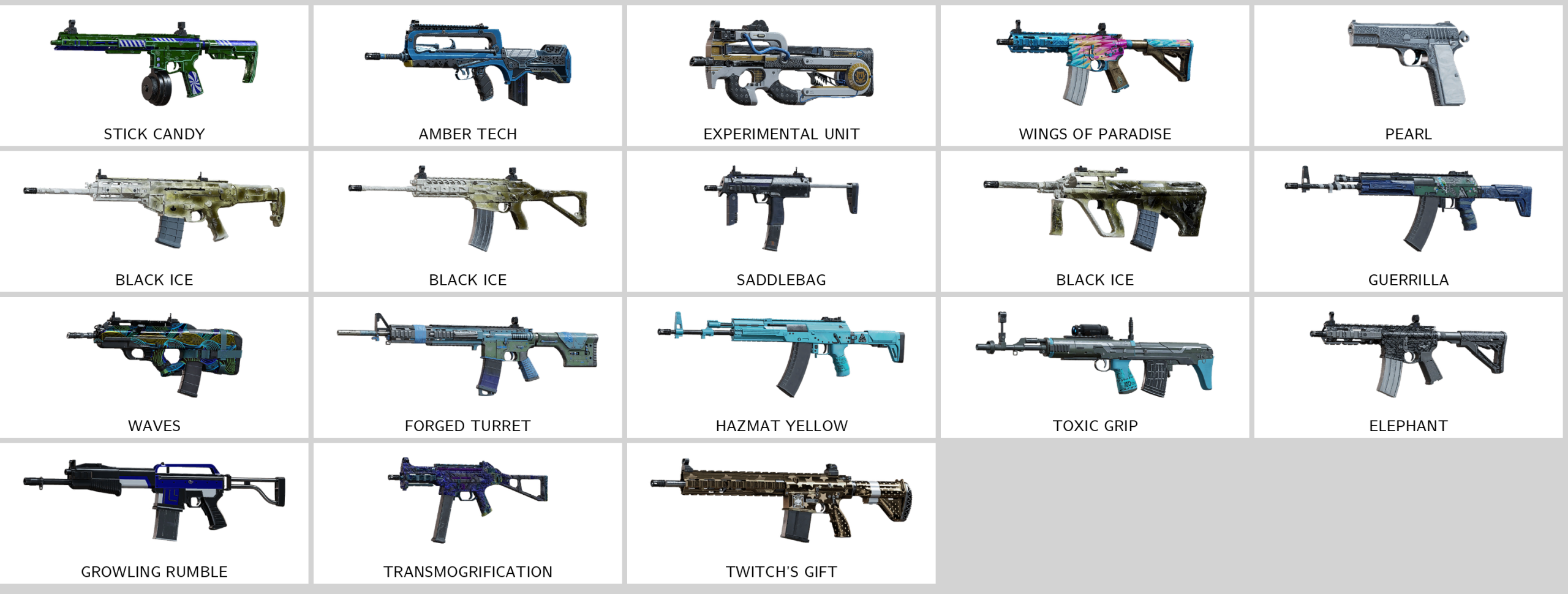 Some of Other Skins: Target (R4C), Bushido (P229), Pearl (Mk1 9mm), Nighthaven MK0 (MP5K), Venetian LMG (ALDA 5.56), Mutant Splatter (L85A2), Saddlebag (MP7), Khokhloma (6P41)…