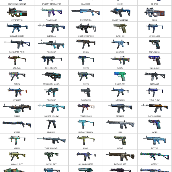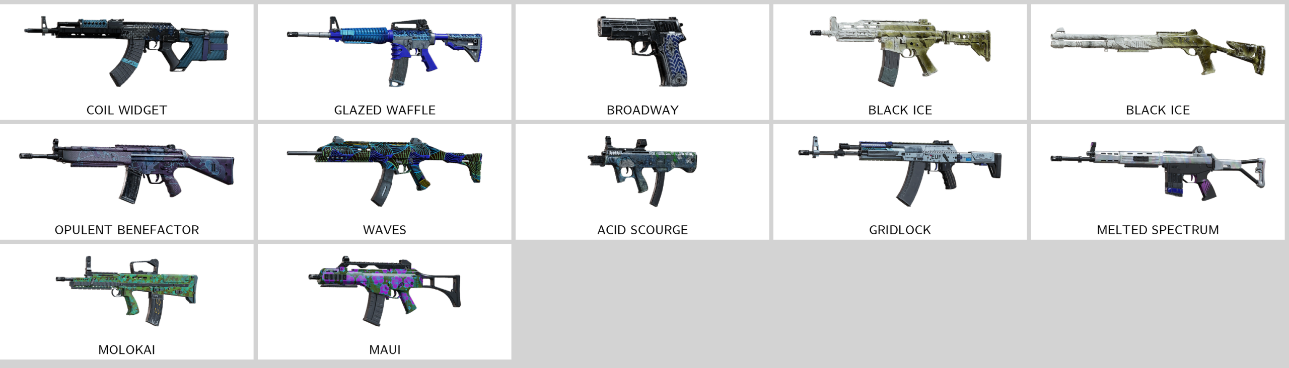 Some of Other Skins: Engraved (AR33), Glory (5.7 USG), Broadway (P226), Opulent Benefactor (AR33), Waves (Scorpion), Irish Rover (556XI), Melted Spectrum (Type-89), Victory (9mm C1)…
