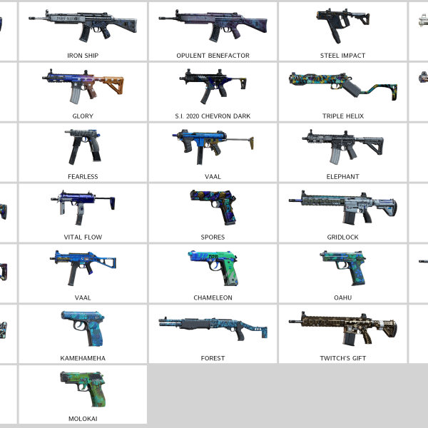 Some of Other Skins: Mission Blacksmith (556XI), Datum Processor (Super 90), Glory (M45 Meusoc), Wolfguard Tech (Spear), Venetian Gondola (ACS12), Elegans Aurantiacus (Spear), Spanish Coffee (USP40), Royal (417)…