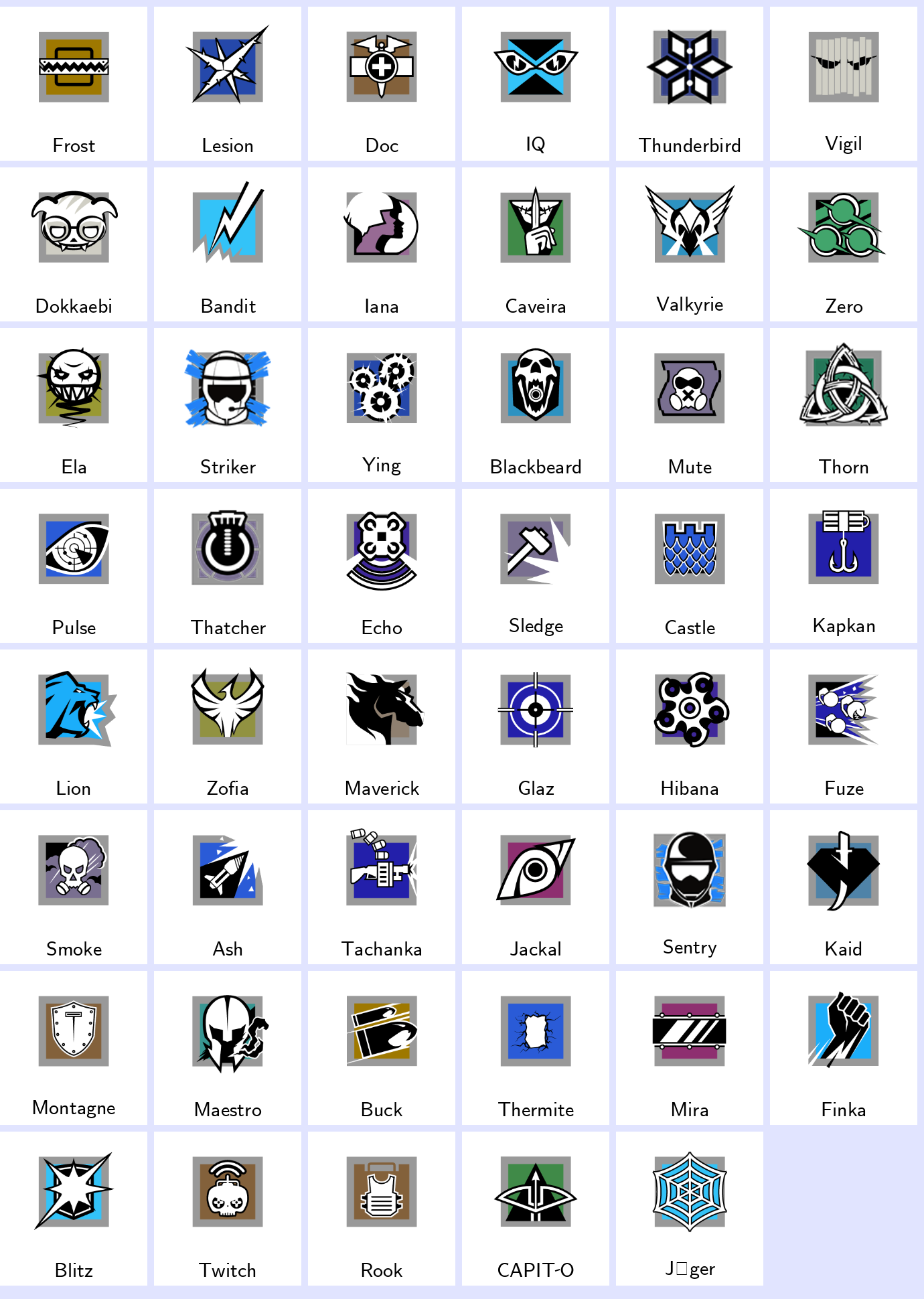 Some Operators: Frost, Lesion, Doc, Iq, Thunderbird, Vigil, Dokkaebi, Bandit, Iana, Caveira…