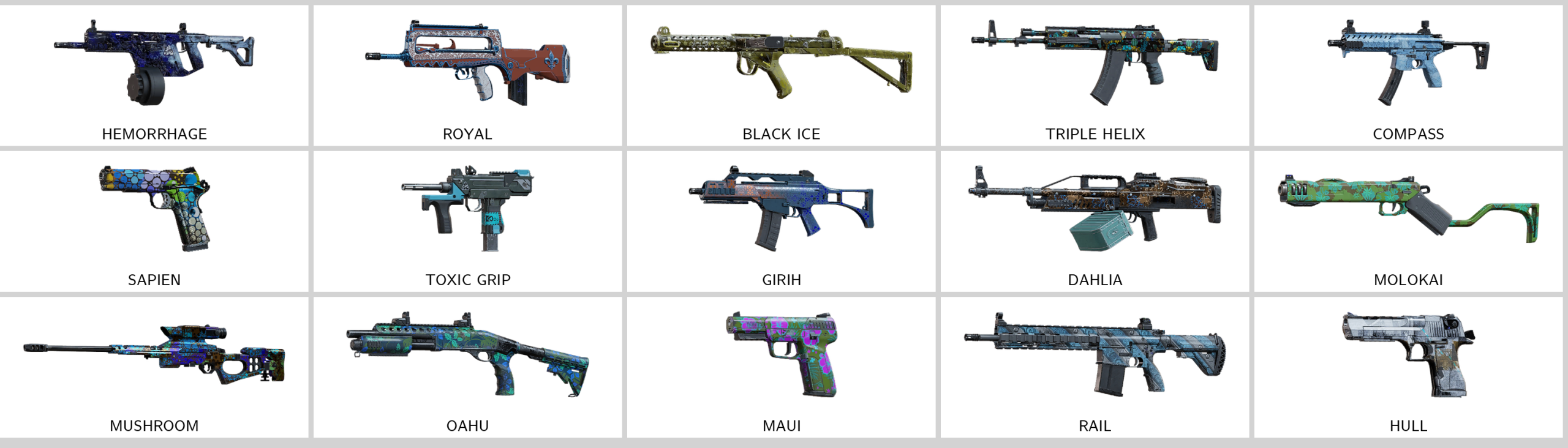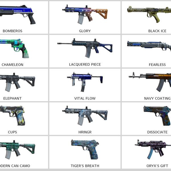 Some of Other Skins: Target (R4C), Royal (F2), Khokhloma (9x19VSN), Rapier Hilt (Commando 9), Royal (417), Compass (MPX), Triple Helix (AK12), Sapien (M590A1)…