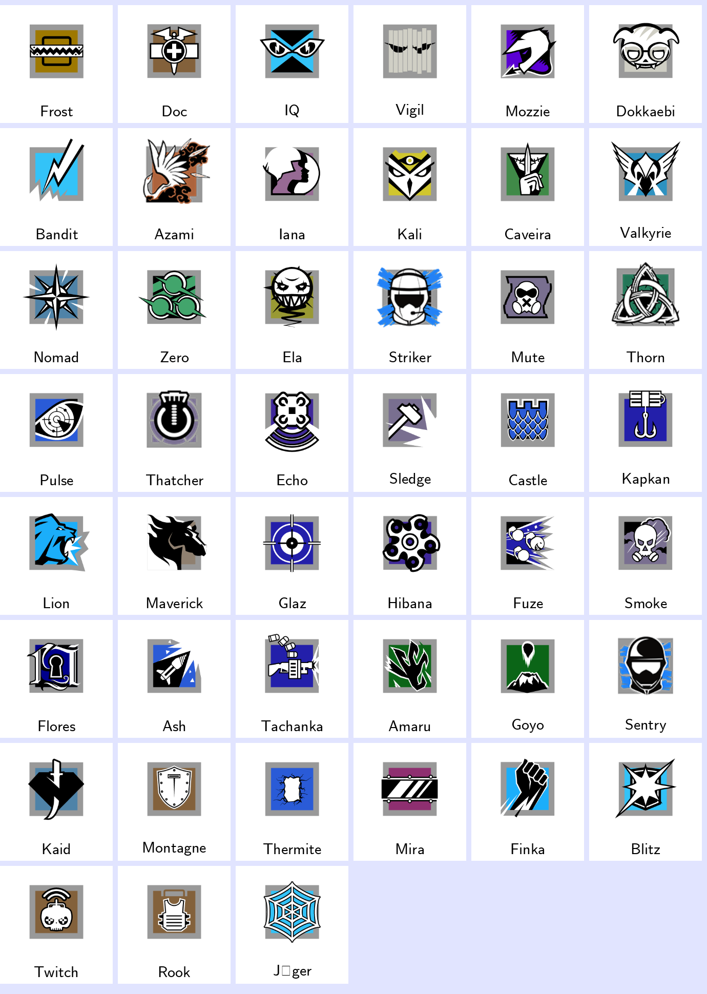 Some Operators: Frost, Doc, Iq, Vigil, Mozzie, Dokkaebi, Bandit, Azami, Iana, Kali…