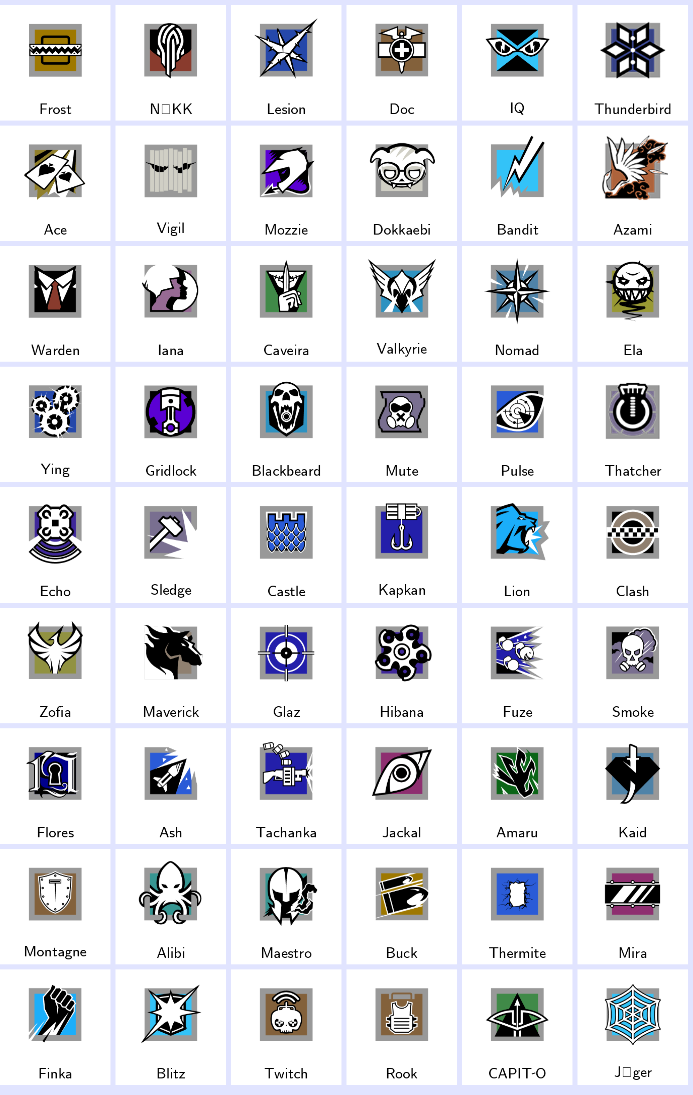 Some Operators: Frost, Nokk, Lesion, Doc, Iq, Thunderbird, Ace, Vigil, Mozzie, Dokkaebi…