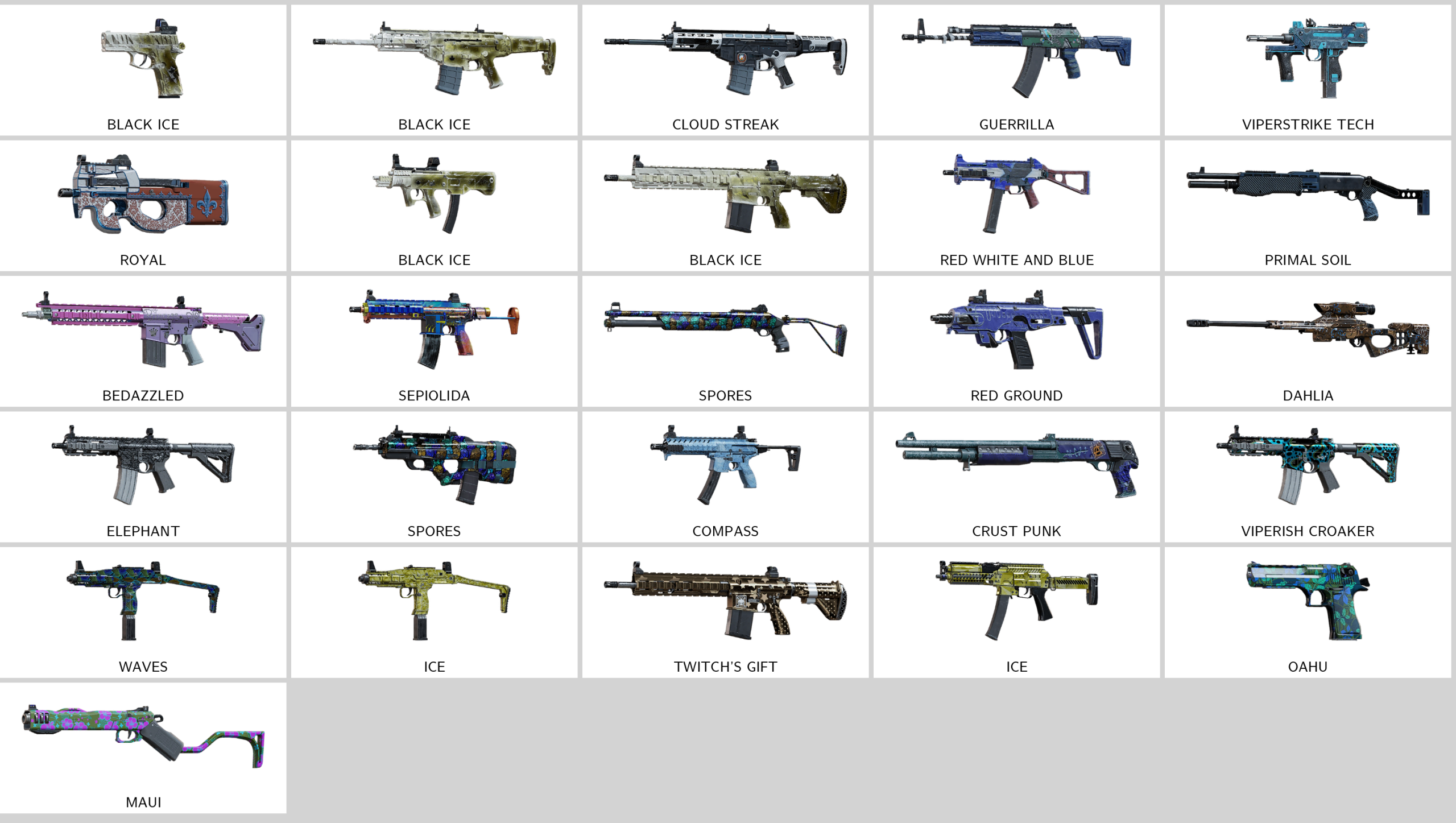 Some of Other Skins: Cloud Streak (ARX200), Target (R4C), Venetian Golden Age (Mx4 Storm), Venetian Gondola (ACS12), Royal (P90), Red White And Blue (UMP45), Primal Soil (SPAS-12), Olympus Shore (ITA12S)…