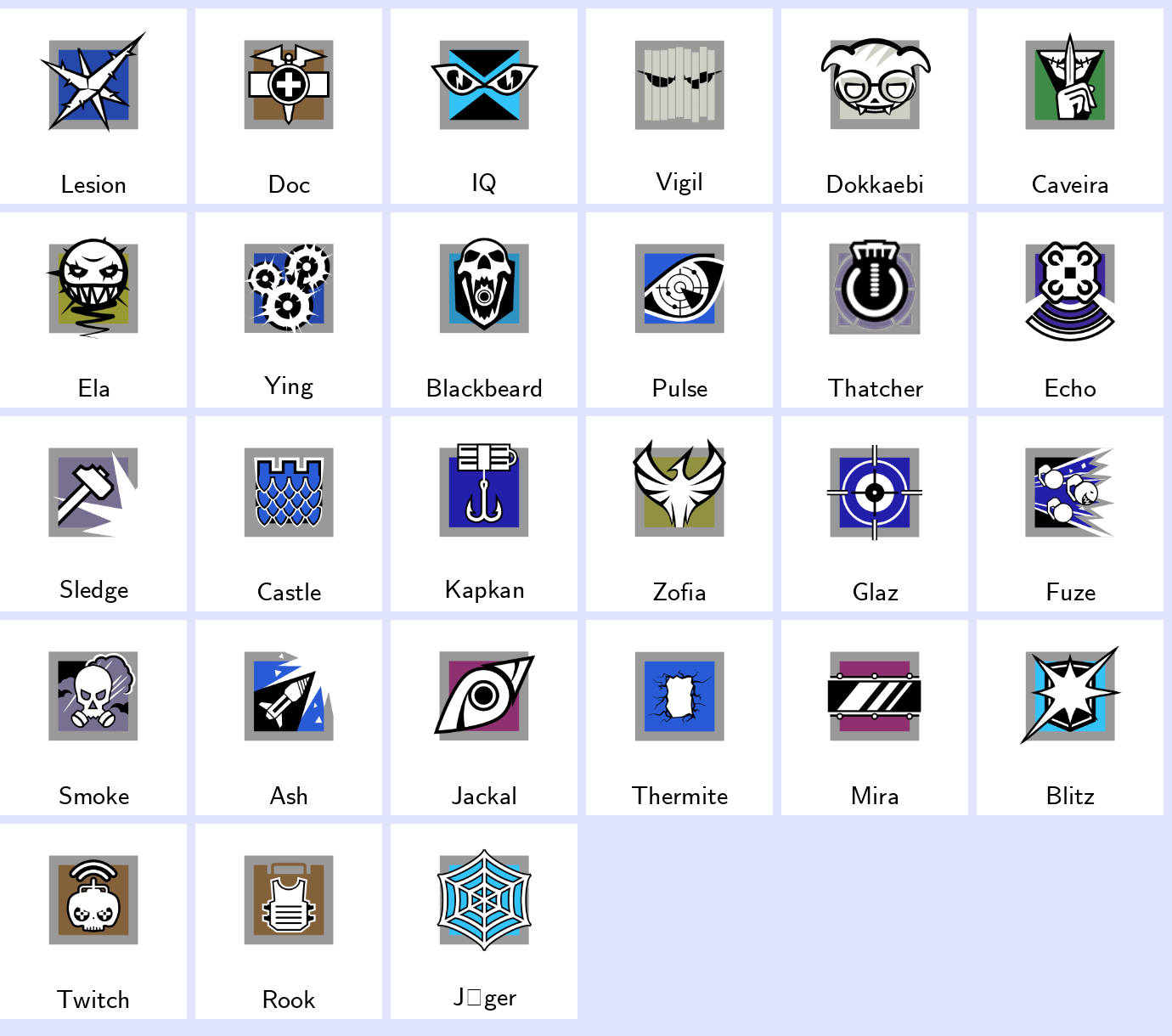 Some Operators: Lesion, Doc, Iq, Vigil, Dokkaebi, Caveira, Ela, Ying, Blackbeard, Pulse…