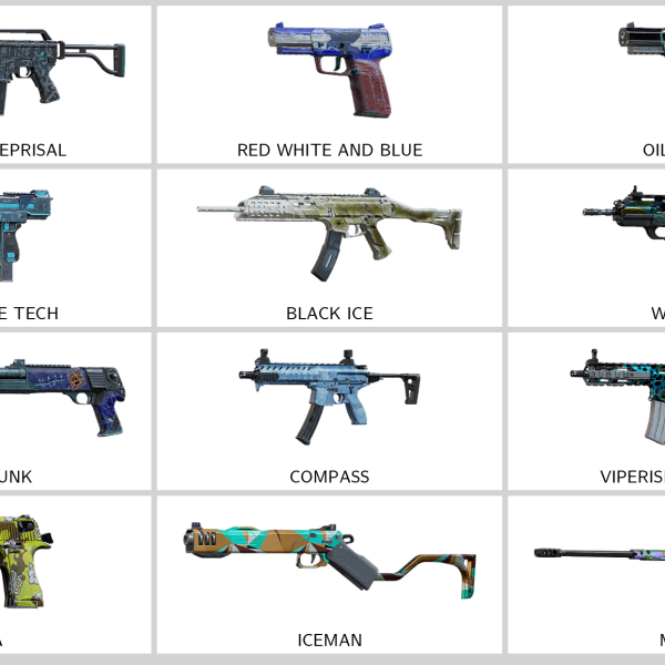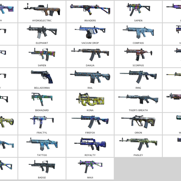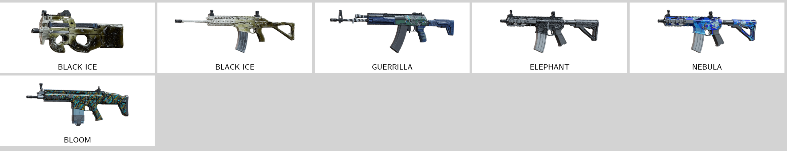 Some of Other Skins: Dwyer Hill (Mk1 9mm), Triple Helix (SASG-12), Bloom (MK17 CQB), Nebula (R4C), Iceman (F2)