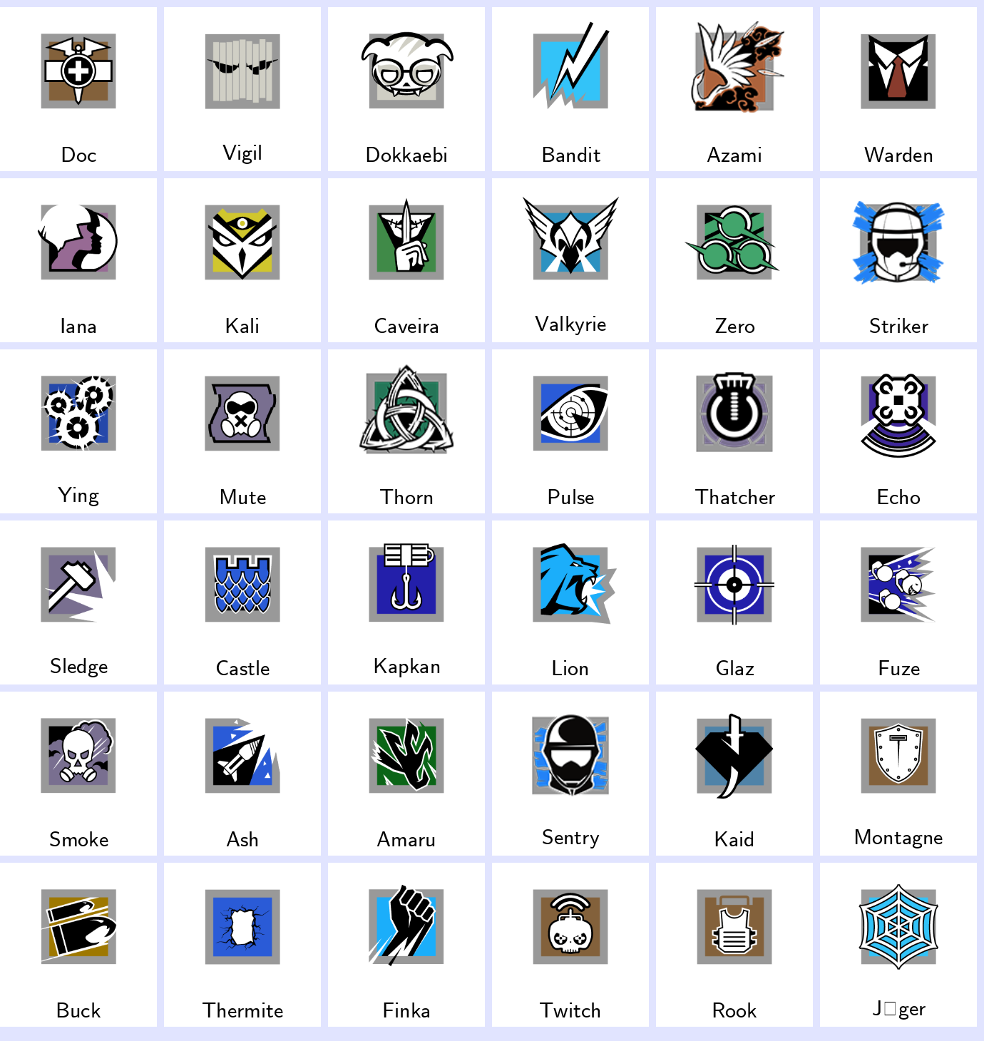 Some Operators: Doc, Vigil, Dokkaebi, Bandit, Azami, Warden, Iana, Kali, Caveira, Valkyrie…