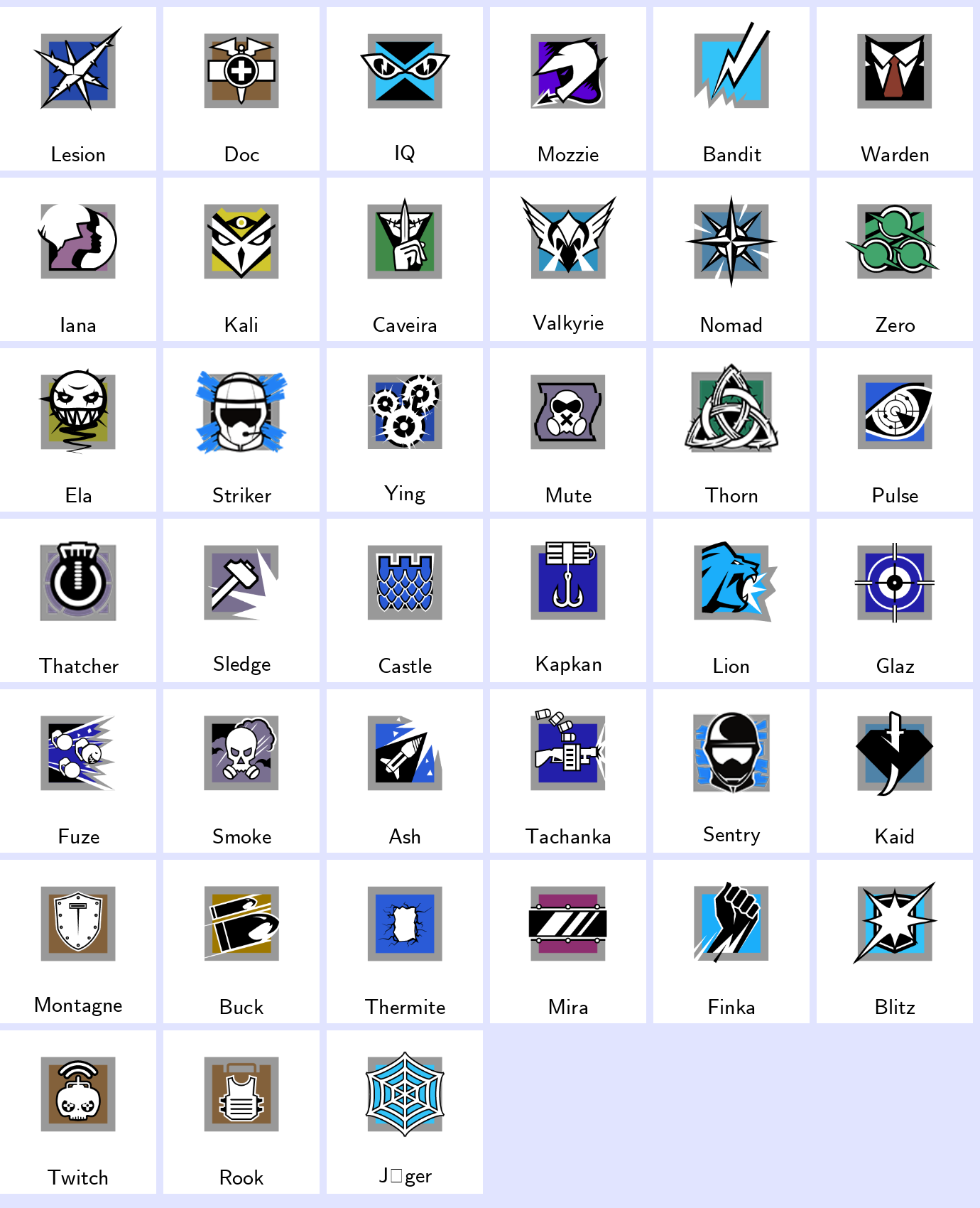 Some Operators: Lesion, Doc, Iq, Mozzie, Bandit, Warden, Iana, Kali, Caveira, Valkyrie…