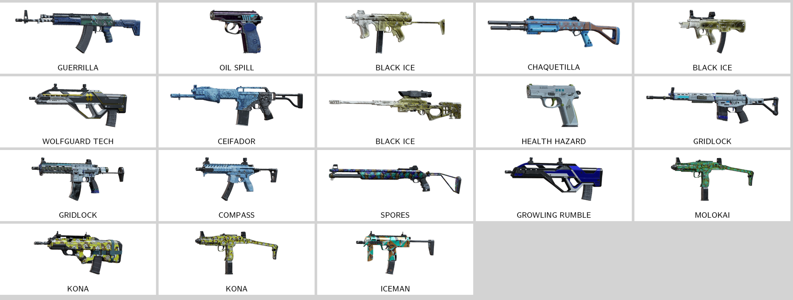 Some of Other Skins: Ceifador (SPAS-15), New Notches (P226), Target (R4C), Wolfguard Tech (Spear), Venetian Spin (Bailiff), Chaquetilla (ITA12L), Oil Spill (PMM), Royal (417)…