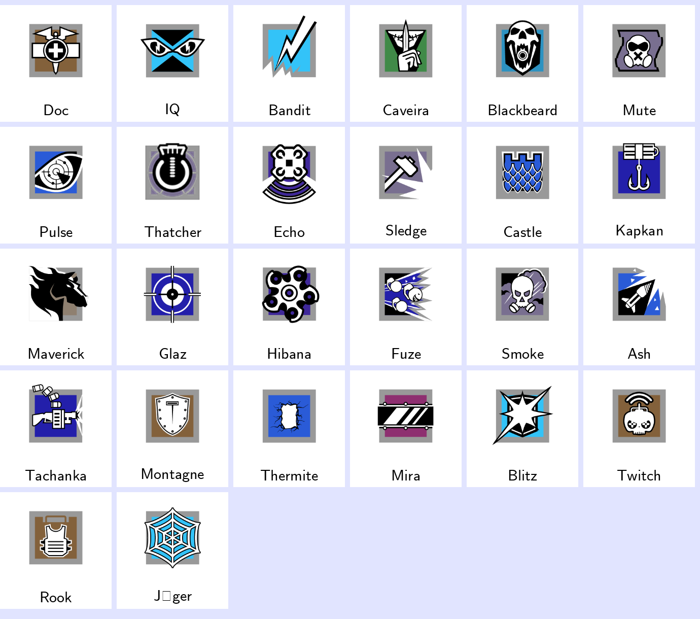 Some Operators: Doc, Iq, Bandit, Caveira, Blackbeard, Mute, Pulse, Thatcher, Echo, Sledge…