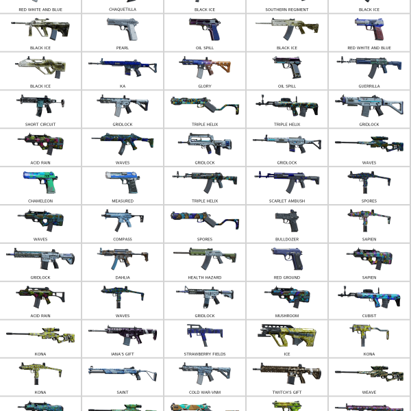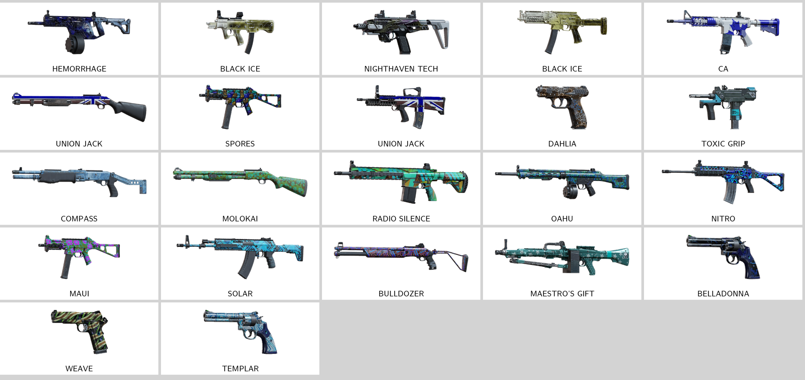 Some of Other Skins: Nighthaven Tech (P10 Roni), CA (C8-SFW), Cyberfriend (556XI), Union Jack (M590A1), Spores (UMP45), Acid Rain (417), Compass (SPAS-12), Marine Jungle (MPX)…
