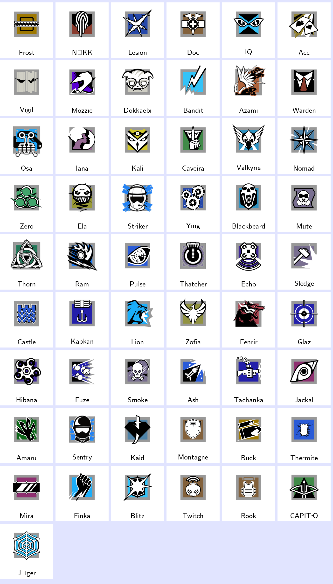 Some Operators: Frost, Nokk, Lesion, Doc, Iq, Ace, Vigil, Mozzie, Dokkaebi, Bandit…