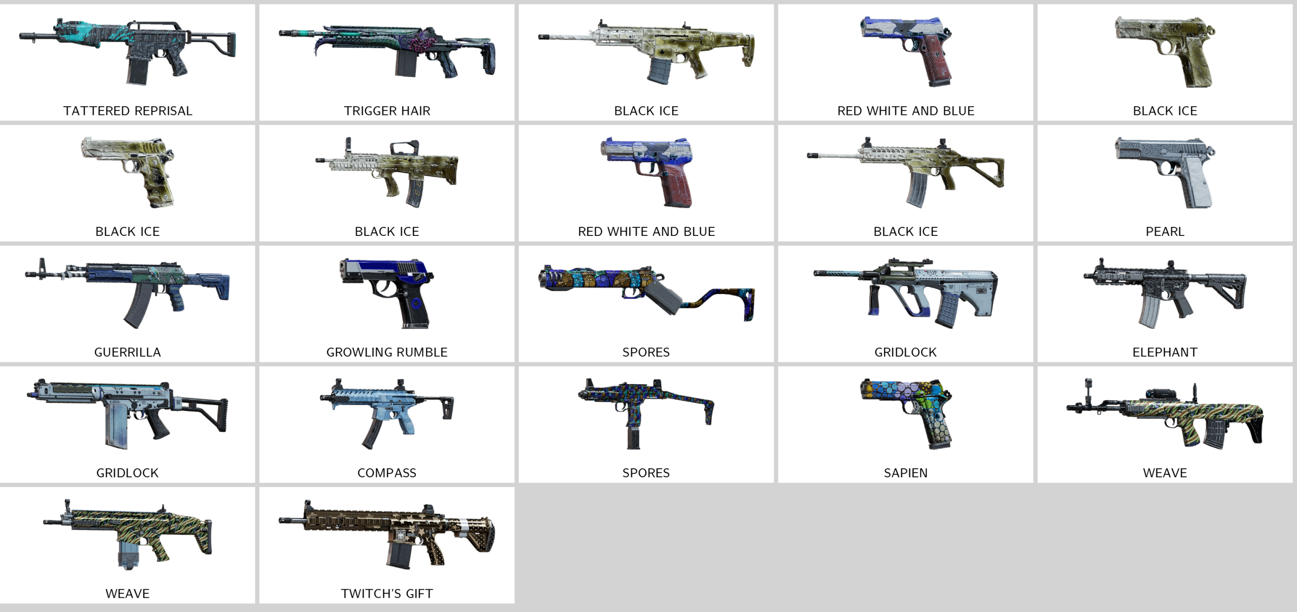 Some of Other Skins: Red White And Blue (M45 Meusoc), On Wings Of Pearl (9mm C1), Glory (M45 Meusoc), Target (R4C), Ancestral Weapon (556XI), Corundum Blue (Vector), Leder (M870), Aegean Blue (T-5 SMG)…