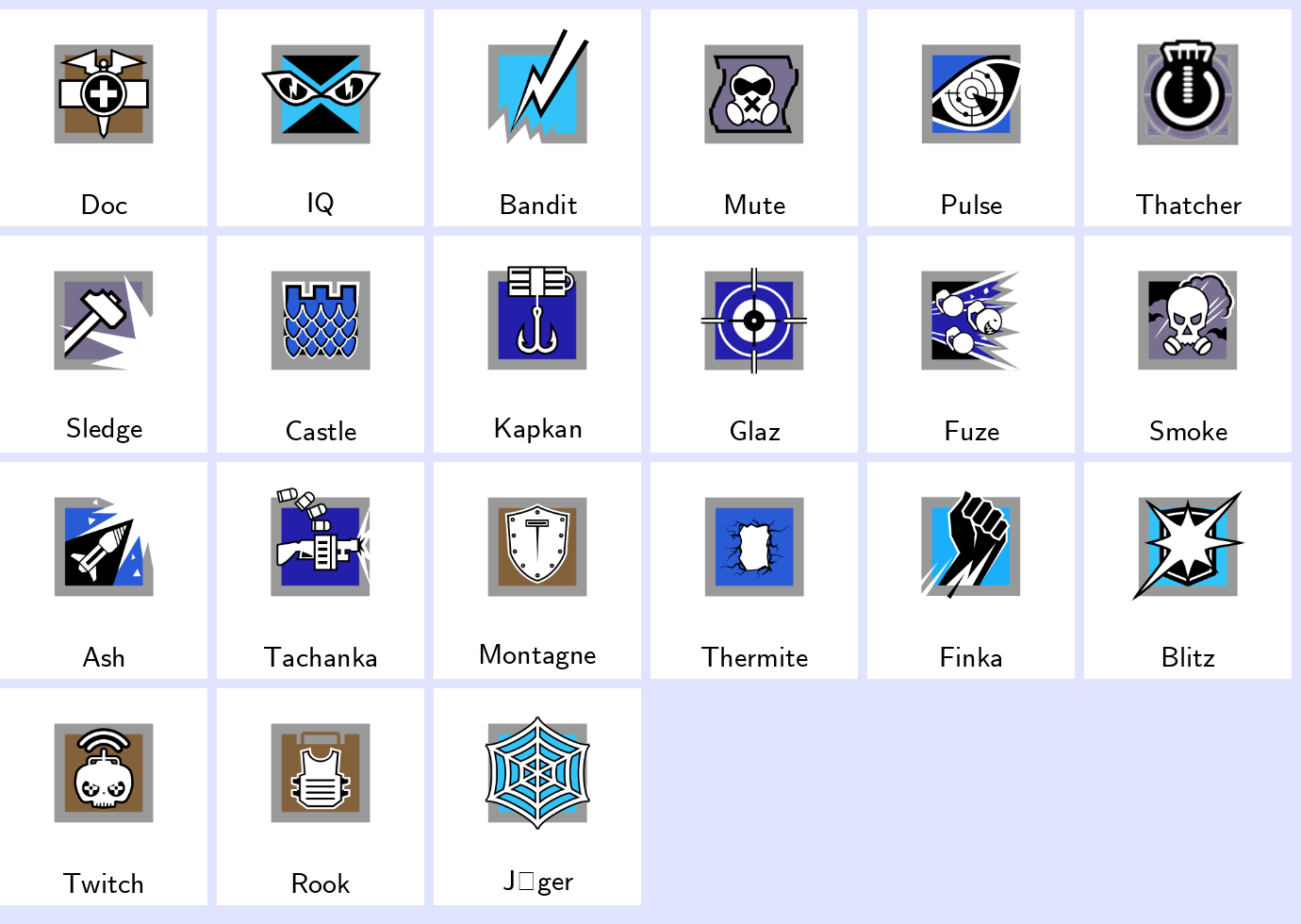 Some Operators: Doc, Iq, Bandit, Mute, Pulse, Thatcher, Sledge, Castle, Kapkan, Glaz…