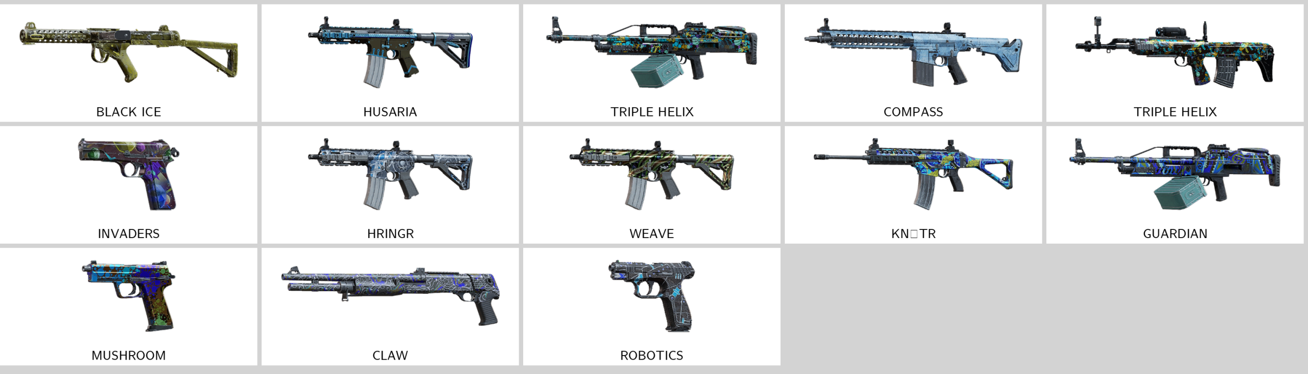 Some of Other Skins: Bundeswehr (MP7), Black Ops (AK12), Engraved (MP5K), Tally (MP5K), Acid Rain (F2), Chameleon (M45 Meusoc), Compass (SR-25), Triple Helix (6P41)…