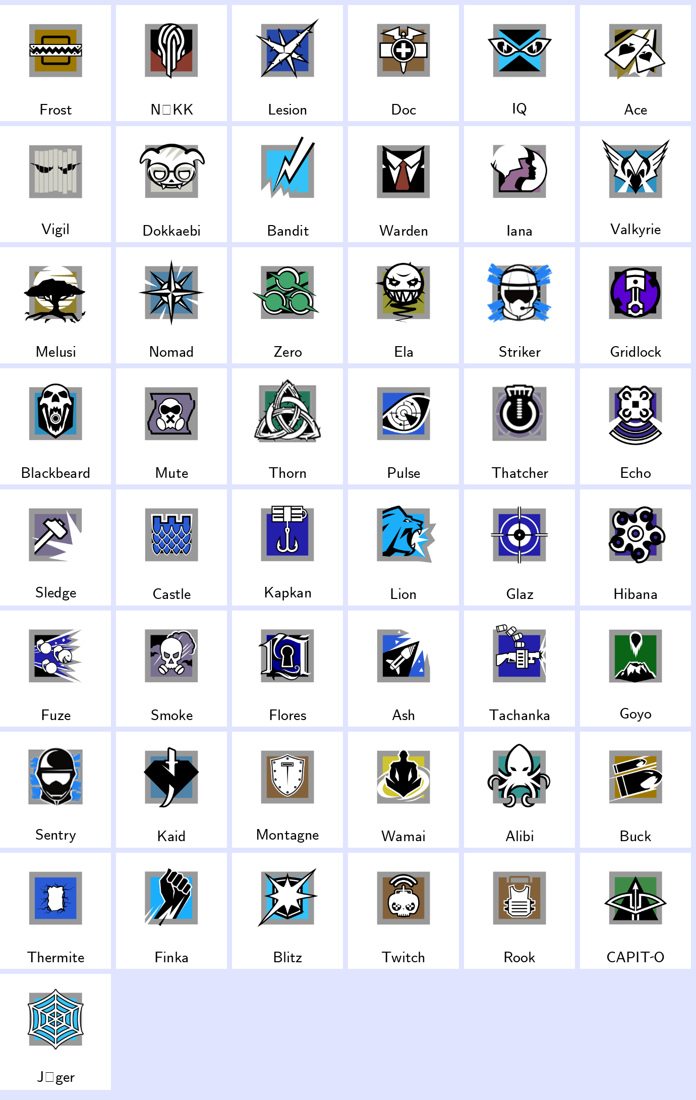 Some Operators: Frost, Nokk, Lesion, Doc, Iq, Ace, Vigil, Dokkaebi, Bandit, Warden…