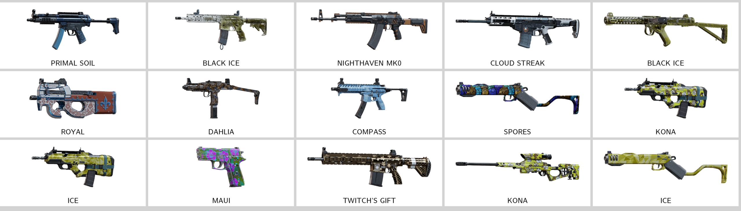 Some of Other Skins: Primal Soil (MP5), Cloud Streak (ARX200), Target (R4C), Royal (P90), Denial-of-Service (AR33), Graviert (M870), Hard Serve (MP7), Nighthaven MK0 (AK12)…