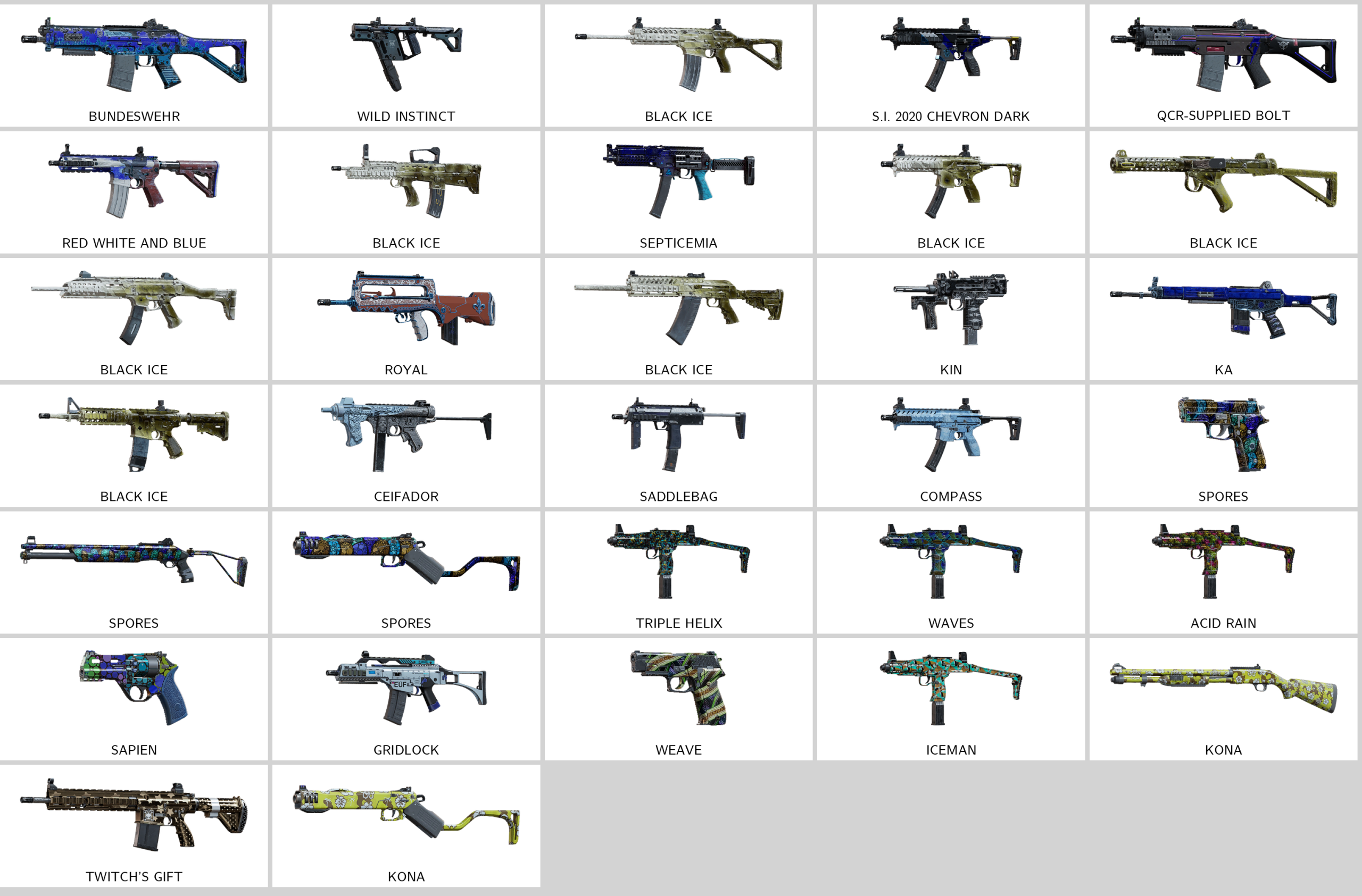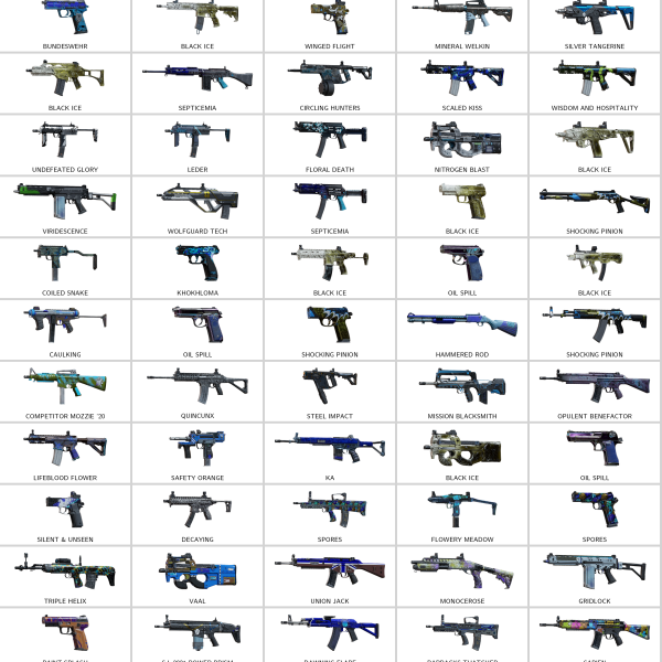 Some of Other Skins: Wild Instinct (Vector), Bundeswehr (552 Commando), Target (R4C), Winged Stallion (Scorpion), Ceifador (PARA-308), Red White And Blue (R4C), Venetian Spin (Bailiff), Royal (F2)…