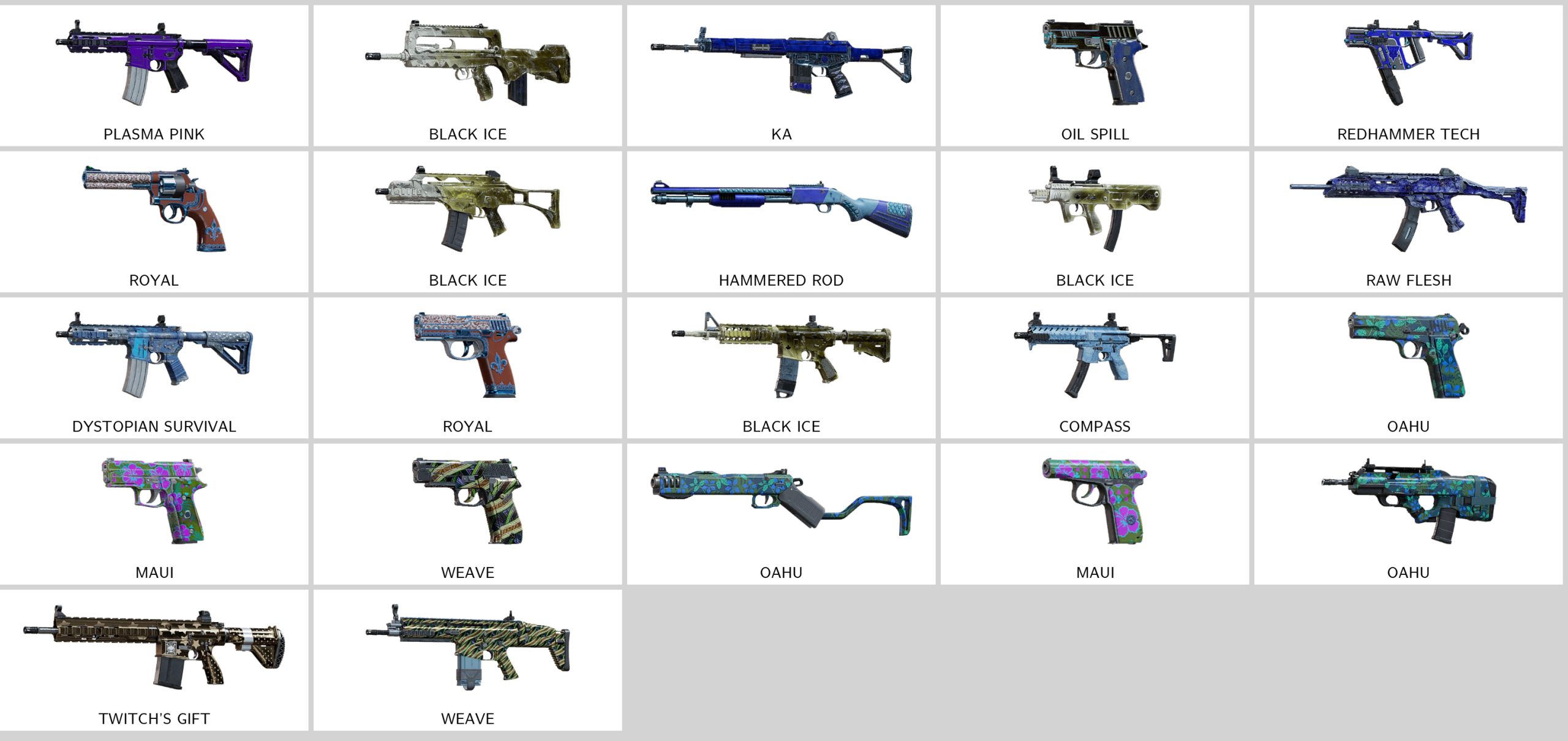 Some of Other Skins: Target (R4C), Viperish Power (P90), Tally (MP5K), Nighthaven MK0 (AUG A2), Ka (Type-89), Bio Shelter (Spear), Royal (P9), Ombre (SG-CQB)…